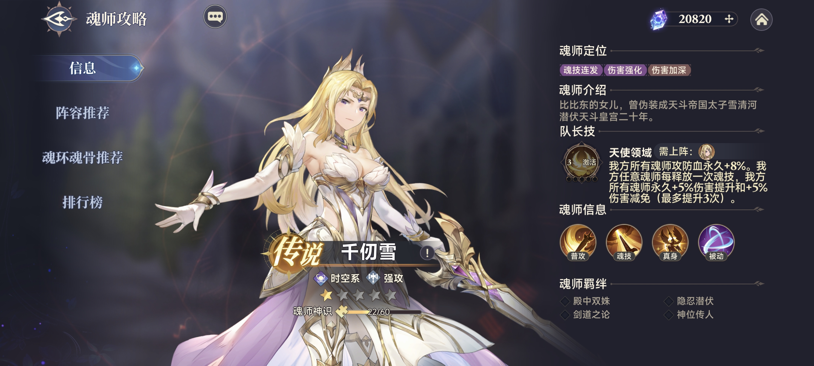 时空系英雄通用的光环型加成,所有时空系英雄均有队长技(并非千仞雪独有),但各自的后半段加成效果不同,前半段基础属性所有时空英雄都一样。