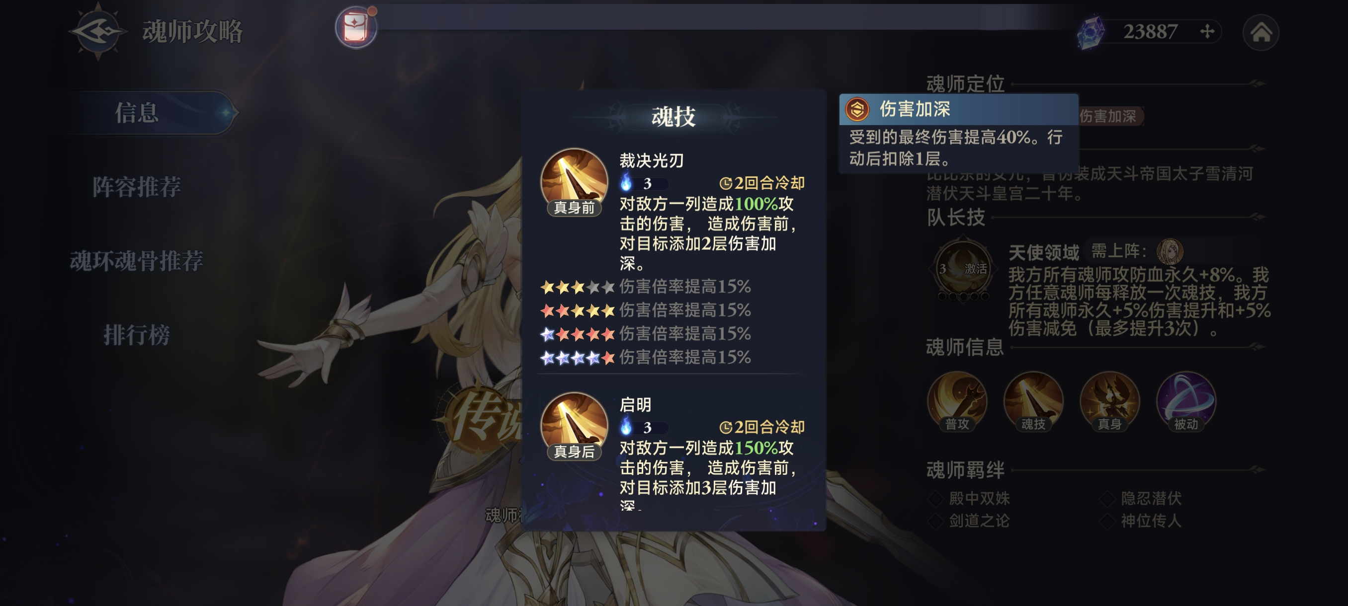 千仞雪的大招为列攻(竖排),常态为100%系数,造成伤害前,为目标附加2层【伤害加深】。真身状态为150%系数,附加3层【伤害加深】。