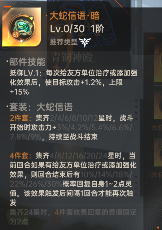 首先还是先说一说四件套大蛇的套装效果:当前回合如果给队友回血或者上增益效果后回合结束时有概率回复自身灵值,又因为苏恩曦本身开了技能后可以给队友再回灵值,可以大大加快队友技能开启速度,而大蛇的四和暗也可以在一定程度上加强苏恩曦的奶量,缓减了苏恩曦那小贫乳奶量不足的情况。