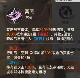 技能是多段单体斩杀伤害,可却不算是一个比较强力的技能,恶心的是她的【潜行】机制,会有一个不取对象的抗性,虽然用群体伤害的技能可以打到酒德麻衣但正常打架的时候有那么多群攻技能给我们放吗,而酒德麻衣的普攻攻击在自身机制内几乎没有能强化自身普通攻击的手段。