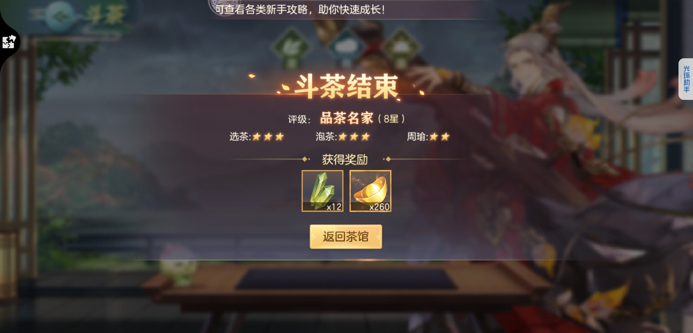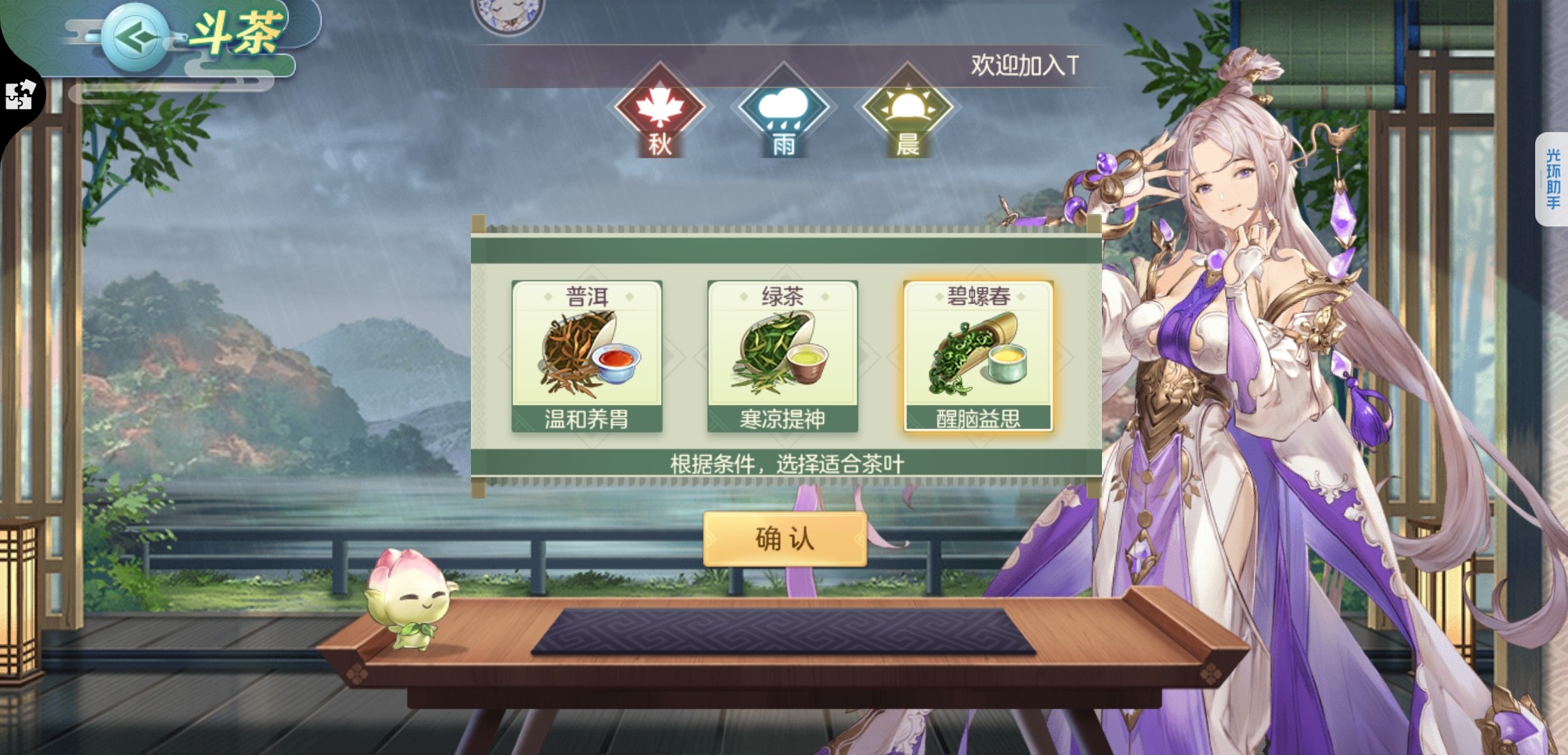 先说说斗茶玩法,分为选茶和泡茶两个阶段,整体门路已经摸清了,斗茶需要选择合适的茶叶,最简单的办法就是看茶桌左边的茶灵的表情,三个选项分别代表了三种情绪,选笑脸的选项就可以了。