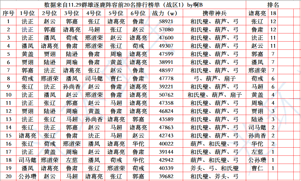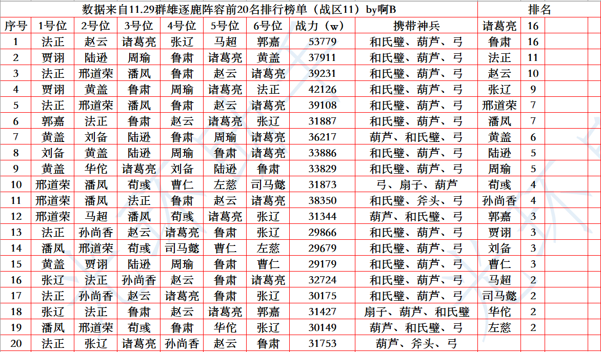 上周迎合三军备战的活动,排名角逐比较激烈。登场率前五的武将是诸葛亮、鲁肃、赵云、张辽、法正。(排名不分先后)