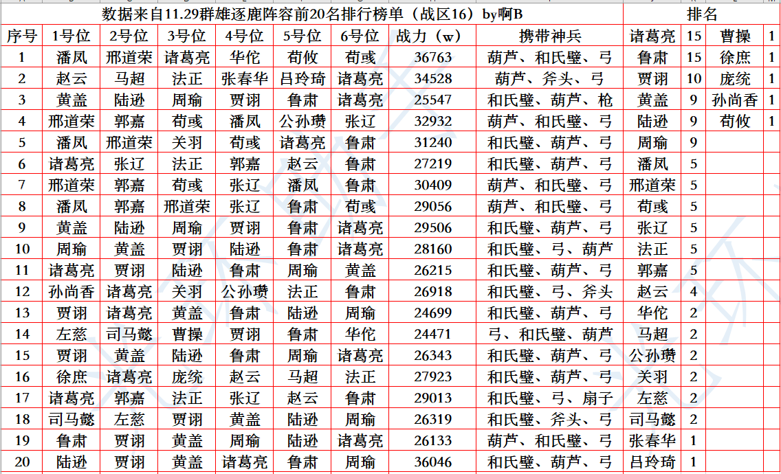神兵搭配方面,和氏璧打头加葫芦弓居多,压制力方面目前和氏璧还是最猛的,葫芦打头的话主要配合潘凤,其它神兵偏冷门。