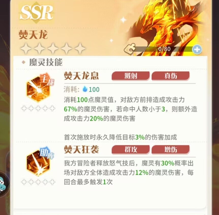 ②焚天龙:5星为满星,5星后最大可以永久降低目标20%伤害加成和15%的普攻伤害减免。