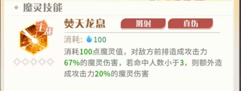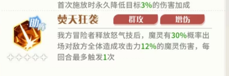 这个助战技能非常百搭,任何阵容都可以选择这个来助战,不过最少需要到3星才比较好用,3星之前魔灵的出场只有30%,而且每回合只能触发一次,比较拉胯。3星后还可以提供免伤。
