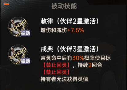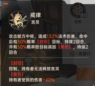 技能可以给对面挂上两种负面效果,一种是【封印】对面不能释放技能,一种是【易伤】使敌人受到的伤害增加40%,前者的概率是30%,后者的概率是50%,这样来看他的技能概率就确实是有点低了,然后他的【封印】是不能释放技能,但对面还是可以进行平A的,如果碰到一些平A伤害也不错的角色(比如绘梨衣和凯撒),那么这个【封印】的效果就只是让对面晚一回合放技能罢了。