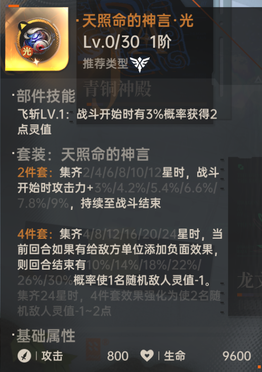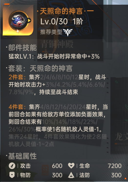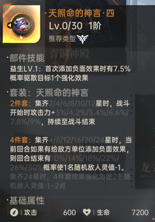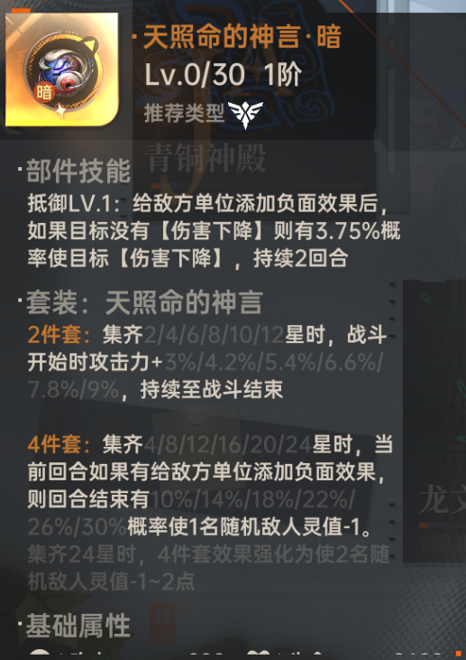 一刻也没有为自己伤害不足感到可惜,现在赶来战场的上我们减益辅助的专属龙文搭配,天照命!天照命的4件套效果就是简单粗暴但十分强力的减少敌方的灵值。四龙文可以在挂上负面效果的同时驱散掉对方的一层增益效果,暗龙文还可以给对方再多挂一个【伤害下降】的负面效果,非常的实用。