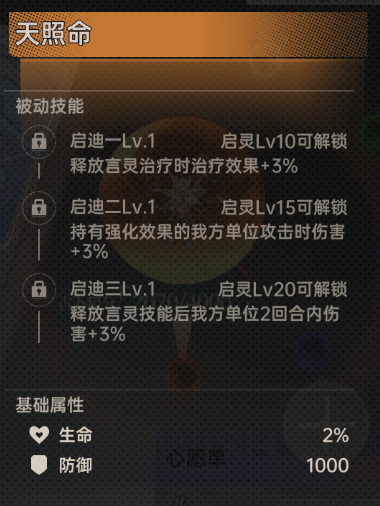 启迪讲解:就是怎么说呢,这个好像也是一个启灵的下位替代,他的效果也是天照命效果的削弱版,如果没有高级启灵给治疗型角色用的话可以先用这个代替一下。