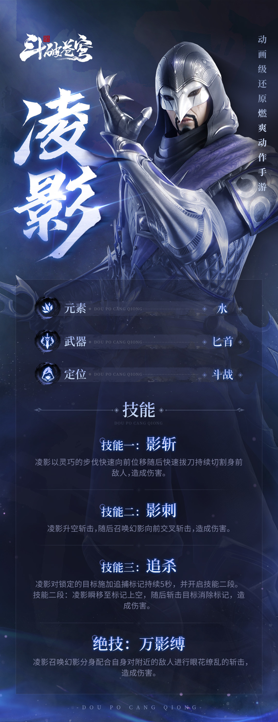 寥寥数语无法概括他的独特魅力,小斗在此就不再赘述,速速放上全新斗者【凌影】的角色海报,给各位斗者姥爷们一睹为快!