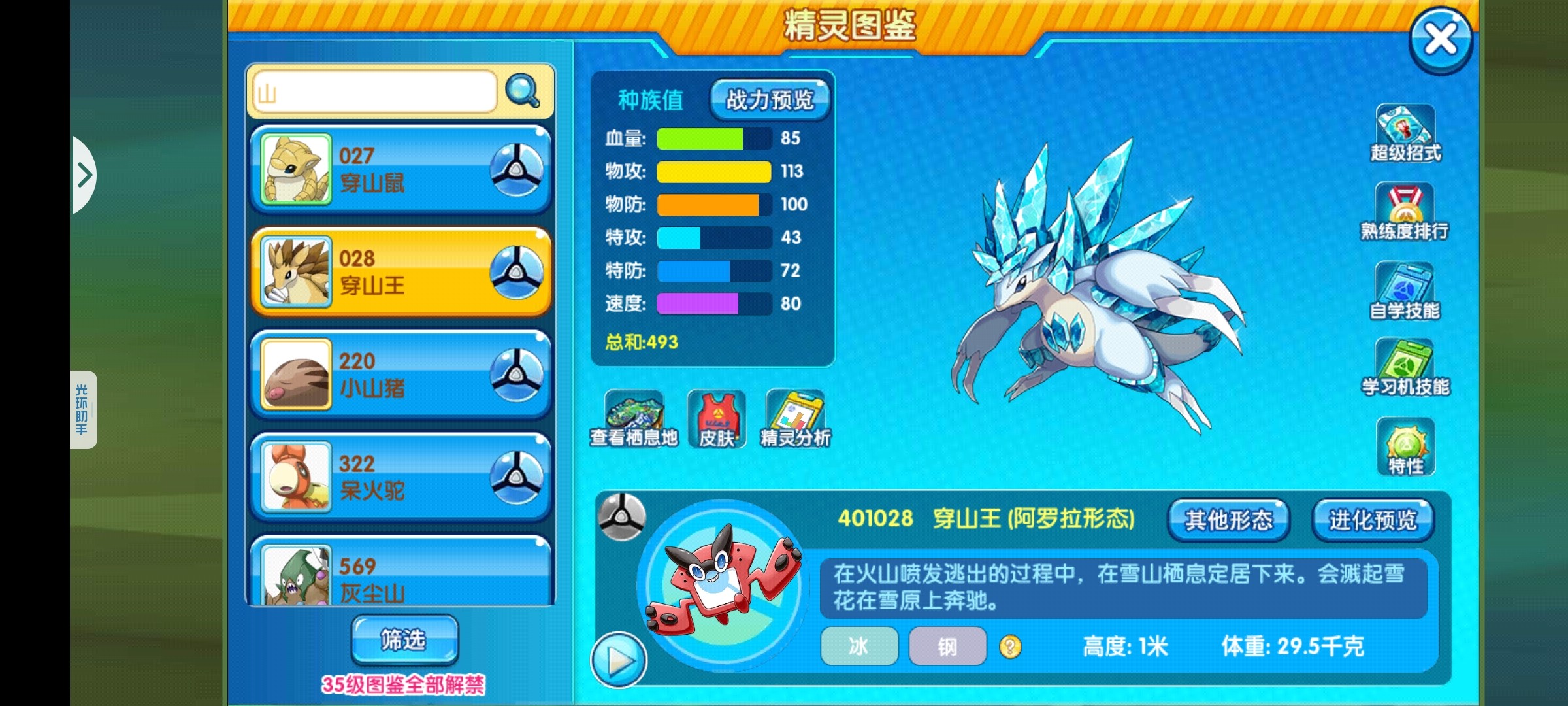 阿罗拉的水属性宝可梦和草属性宝可梦比较多,为了生存下去,它们选择改变自身的属性以及主要的栖息地,所以才会变成现在的这个样子,阿罗拉样子的穿山王除了腹部和嘴巴周围是白色的以外其他地方全是浅蓝色的。原来背上的毛发被冰覆盖,变得更大而且更锐利。