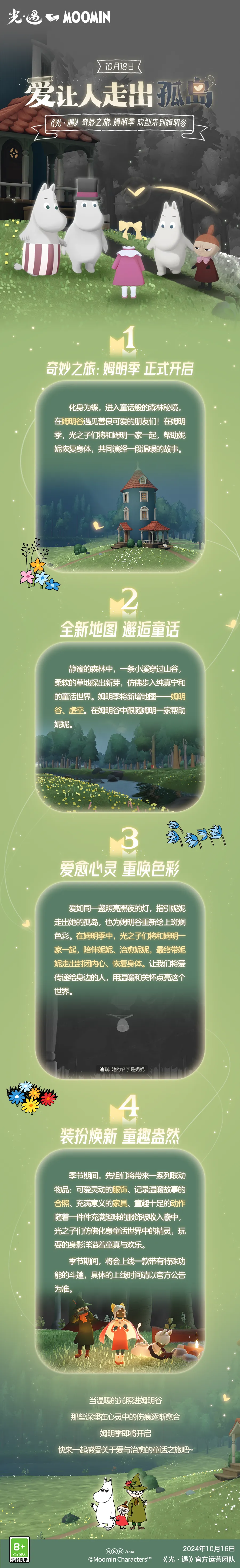 爱让人走出孤岛丨奇妙之旅:姆明季更新内容公告是泽哦发布于 2024-10-16关注奔向山谷拥抱森林与溪流光愈心灵让爱陪伴成长📖奇妙之旅:姆明季将于10月18日维护后正式开启请旅人们仔细阅读更新公告,了解更多季节信息✨童话书正静候旅人前来阅读10月18日 姆明谷见~@Moomin姆明官方 姆明季攻略汇总
