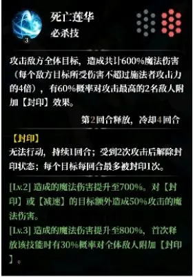 ○核心技能:我的核心技能【死亡莲华】攻击敌方全体目标,造成共计600%魔法伤害(每个敌方目标所受伤害不超过施法者攻击力的4倍),有60%概率对攻击最高的2名敌人附加【封印】效果。