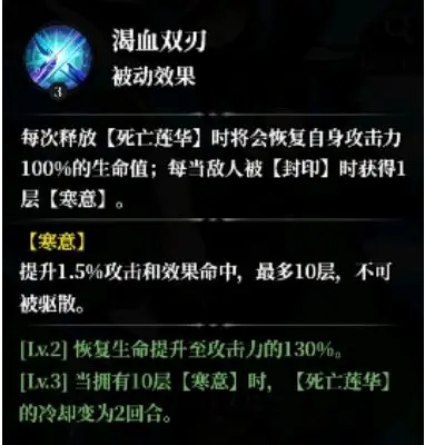 ○辅助技能:除了核心技能外,我还拥有多个辅助技能,如“渴血双刃”,每次释放【死亡莲华】时将会恢复自身攻击力100%的生命值;每当敌人被【封印】时获得1层【寒意】。