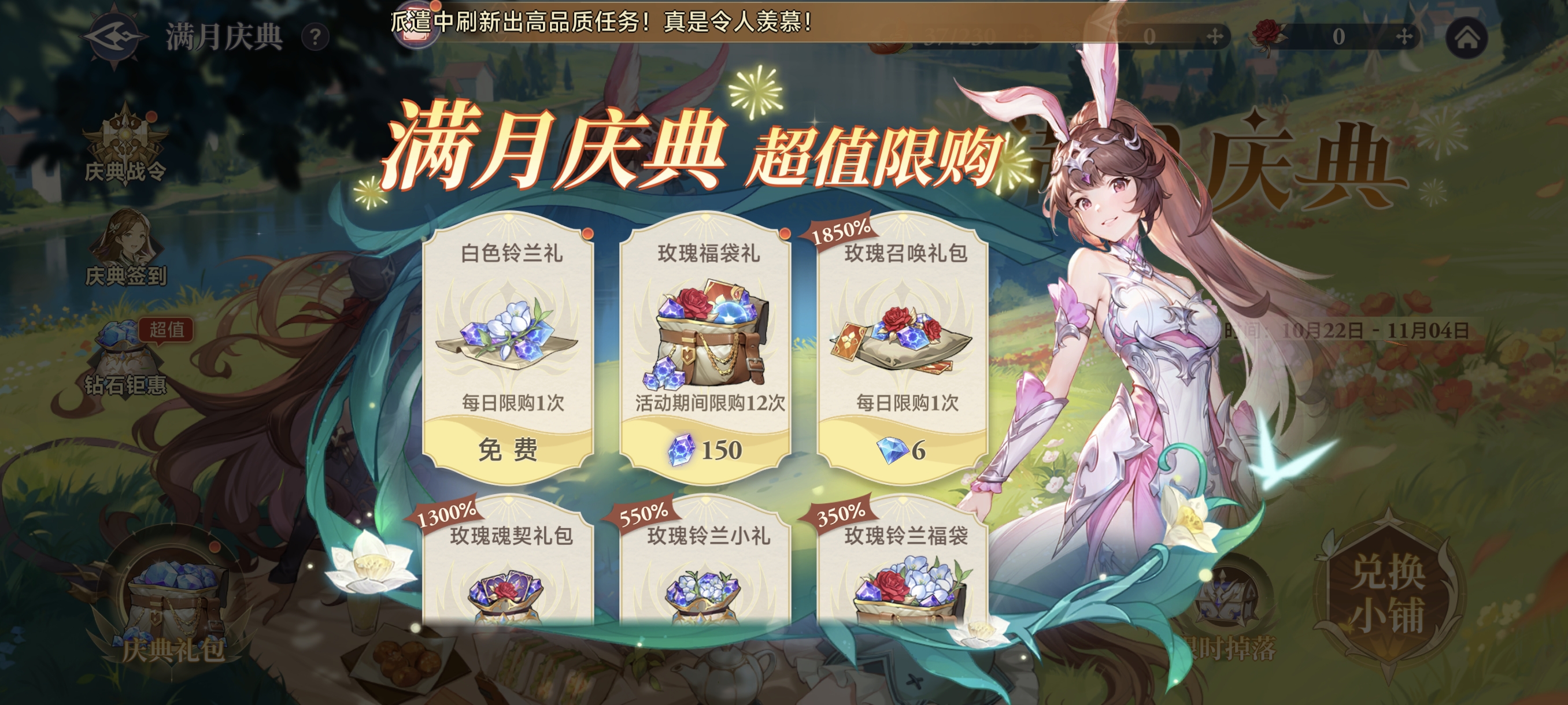 每天可白嫖获得2个金色玫瑰+5个庆典福袋+900个白色铃兰,即活动共计可白嫖28个金色玫瑰+90个庆典福袋+12600个白色铃兰。