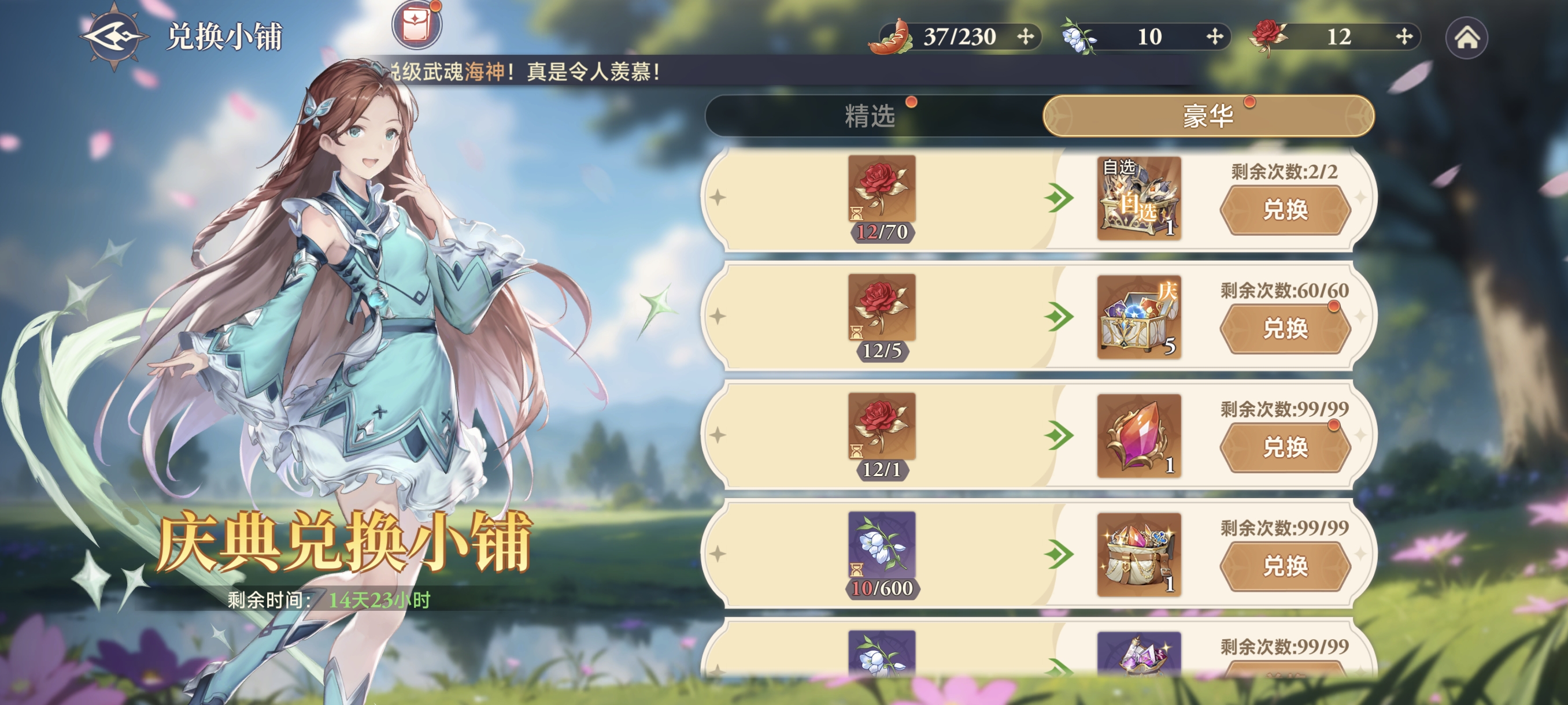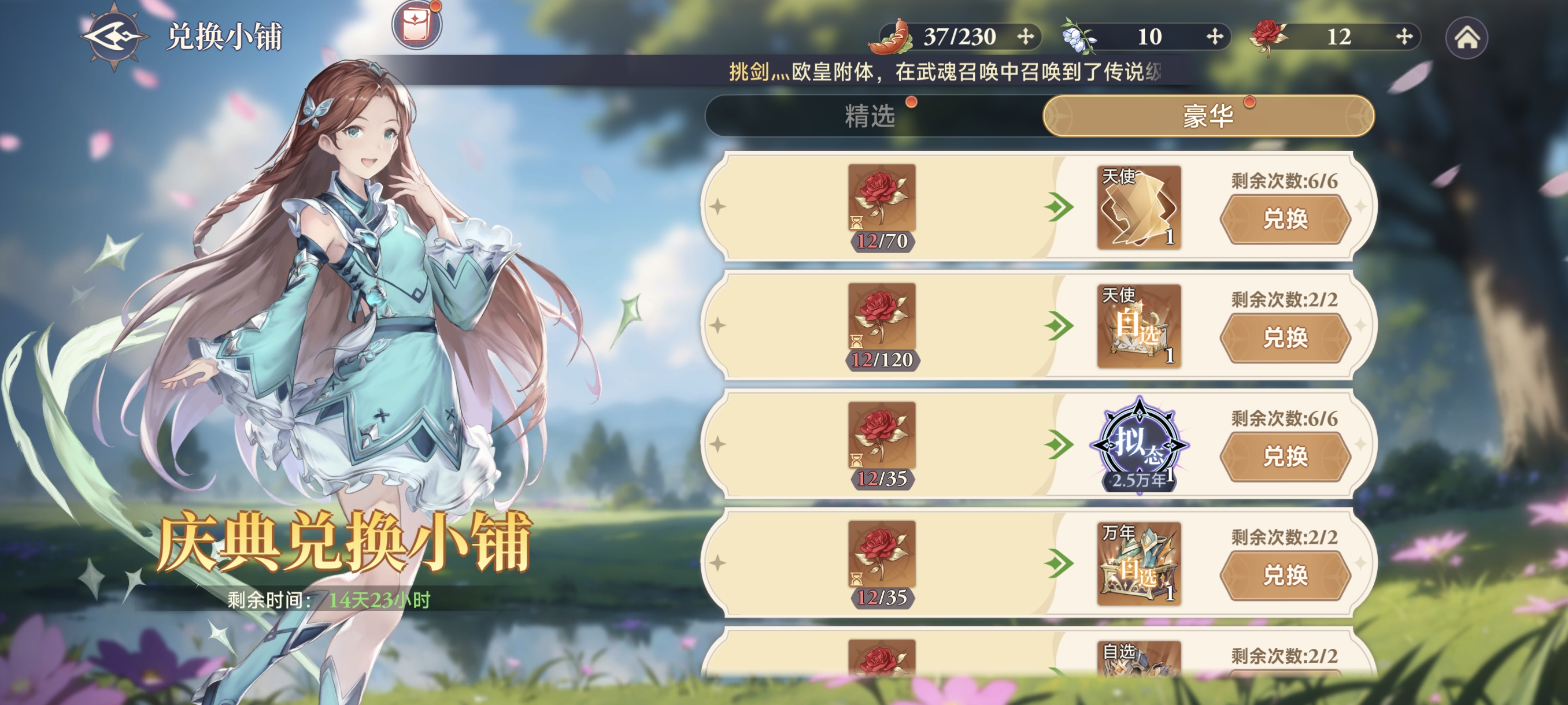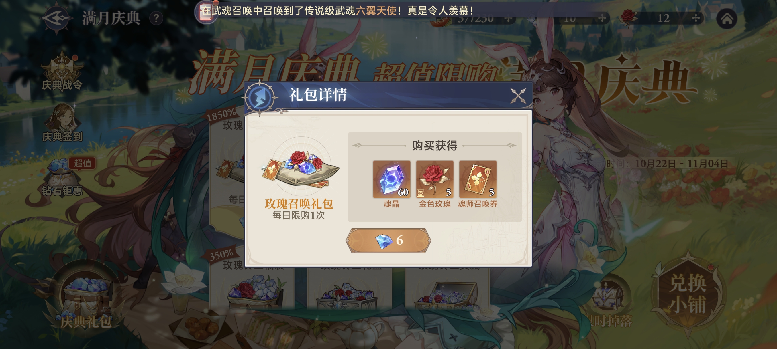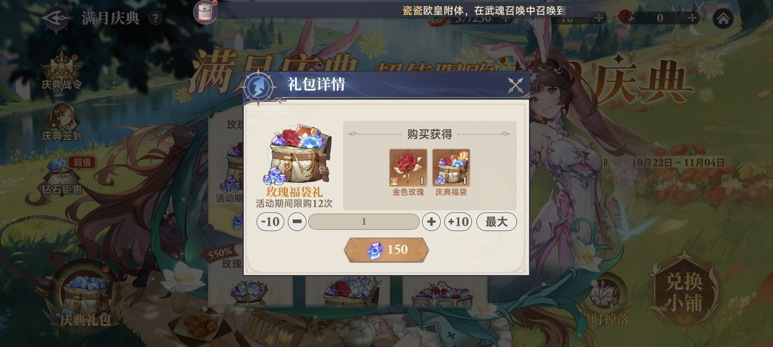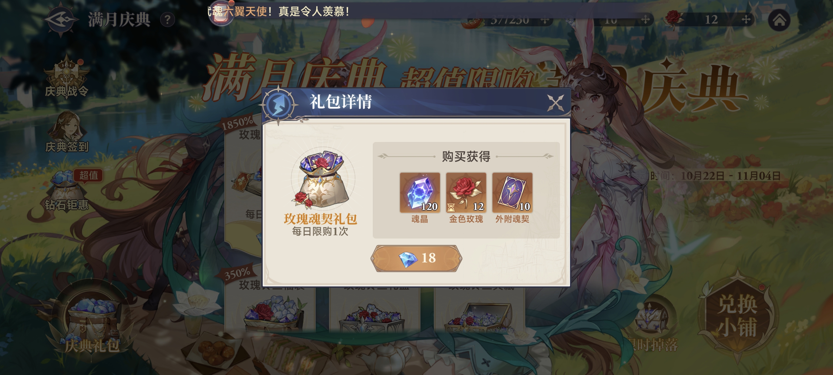 1800魂晶可购买12个金色玫瑰+12个庆典福袋。