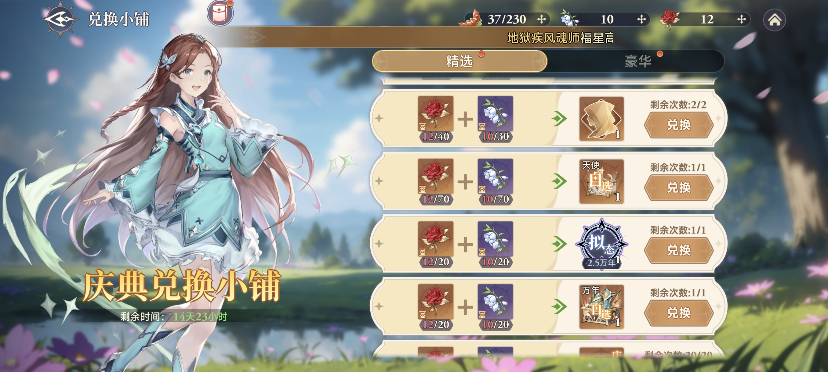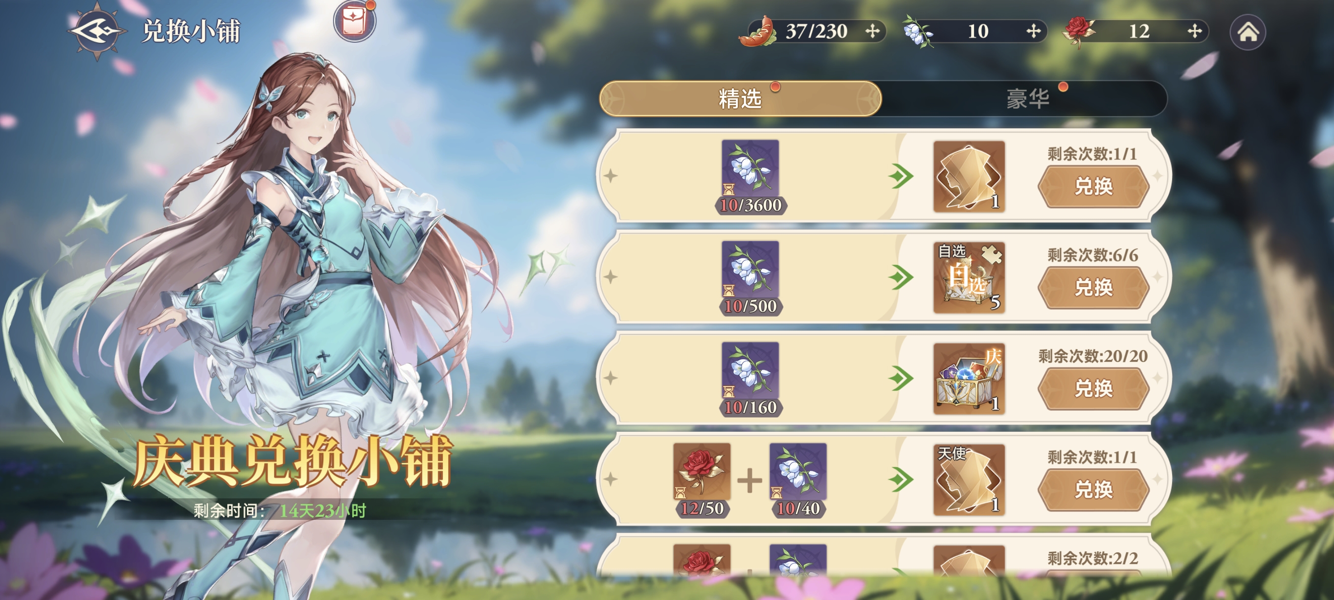 活动最终资源兑换商店,活动中获得的白色铃兰(低级代币)和金色玫瑰(高级代币)均在此处兑换。