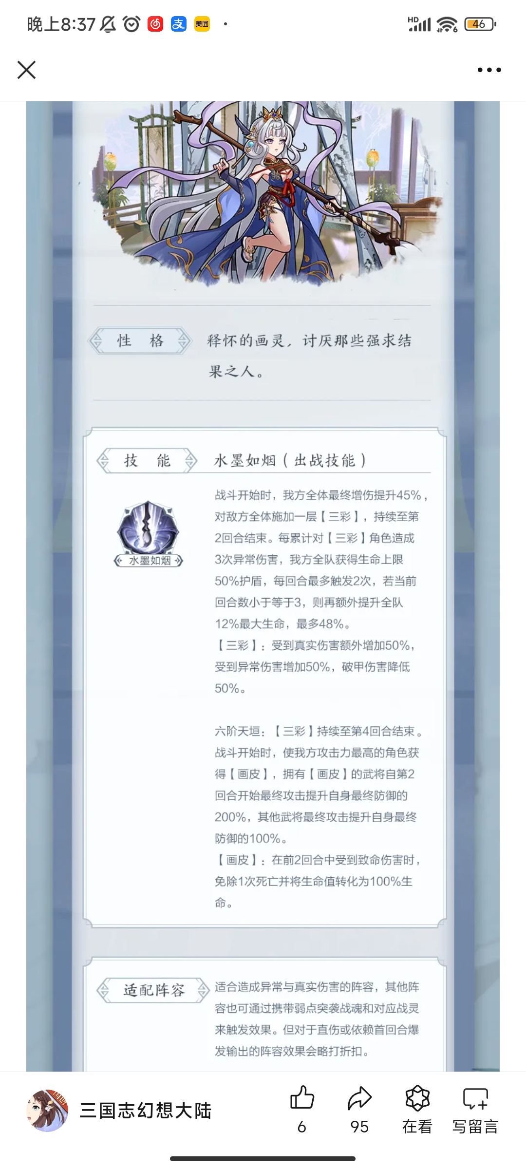 ①新善灵画灵有着十分优秀的数值,在PVP方面提供了最终伤害加成和护盾、血量上限以及减少对面的破甲伤害、增加对面受到的真实伤害以及异常伤害属性。主要搭配具有较高真实伤害以及异常伤害的武将,如命魂曹操和命魂孙权,以及后续的新SP的火烧等。