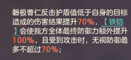 ②6阶后可以锁血一次,并在第二回合使一攻武将最终攻击提升自身最终防御200%,其他武将获得100%。然后SP曹仁铁凯效果可以提升全体100%的最终防御。一方面来说锁血是个不错的效果,另一方面来说,在加攻击力这个点上,一攻丹香配合SP诸葛亮时有着十分恐怖的爆发。