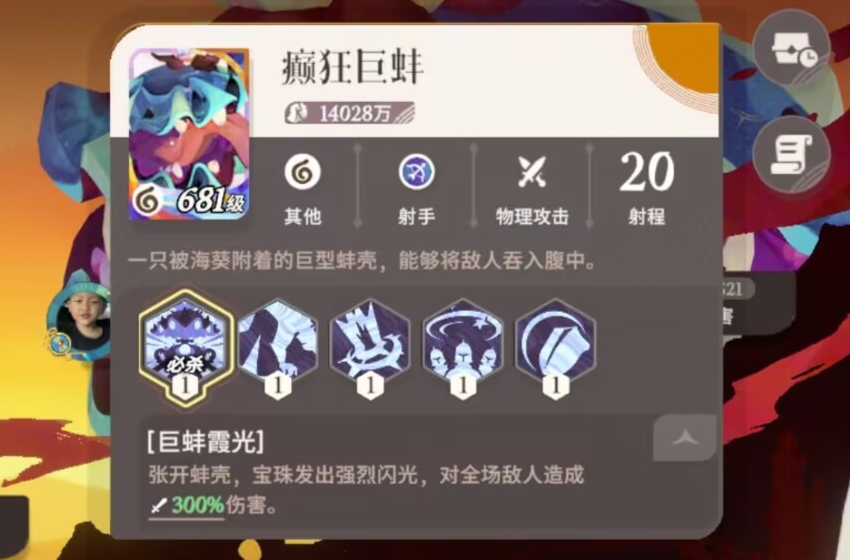 ①【癫狂巨蚌】必杀技能为:巨蚌霞光。