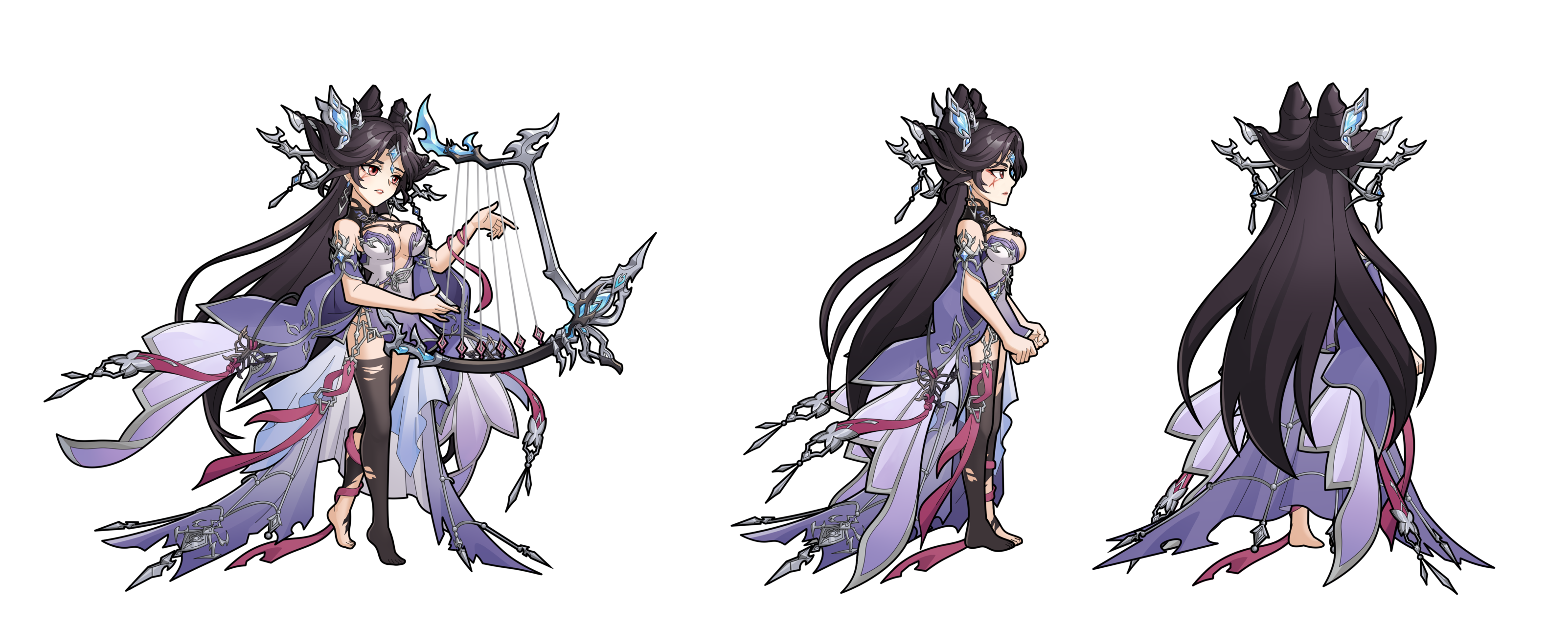 本次设计巧妙融入蜘蛛的意象,勾勒出一位柔弱魅惑的美女猎手形象。在幽暗洞穴中,伏寿身着一席紫色战损长裙,头戴蜘网式样发簪,身上的伤痕与破损丝袜更添几分楚楚动人之态。她手腕处似有铁链禁锢,殊不知这只是她布下的层层伪装,等待着猎物的上钩。