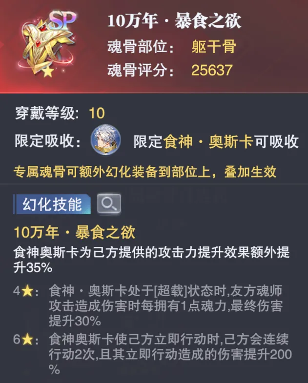 接着SP奥斯卡的躯干魂骨主要效果在于机制的相关改进和长图增伤,具体的增伤倍数不太好算,因为和大家的练度与实战操作相关,不过维一个人认为就这么一块基础的专属魂骨都已经卖到超过400RMB和小1W钻石的幅度了,大佬玩家可以随意,普通玩家还是直接略过这块专属魂骨算了,不要也罢。(随着游戏中专属魂骨和进化魂骨数量的大幅提升,之前官方对于基础魂骨的定价已经有了不小的下滑,甚至很多都是等于白送,但这次的SP奥斯卡魂骨却又给调回去了,真是......)