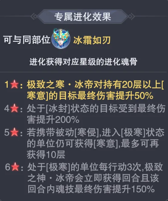 然后SP冰帝的进化魂骨售后来的是真快啊......这块进化魂骨的核心作用就是长图增伤,PK也有一点但不多,毕竟目前冰帝的PK除了用来卡卡SP唐昊,其它方面的效果并不算特别突出,可以作为王者赛等关键比赛的ban选替代而已,而这块进化魂骨理论上可以提供的长图增伤幅度约为250%-400%,此外还有额外10层“寒意”带来的400%受到终伤提升与相关的增益效果,所以理论上来讲这个进化魂骨的提升幅度还算是能达到中等偏上的水平,但小1W钻石+1400元左右的成本嘛,大部分朋友也是望而却步了......