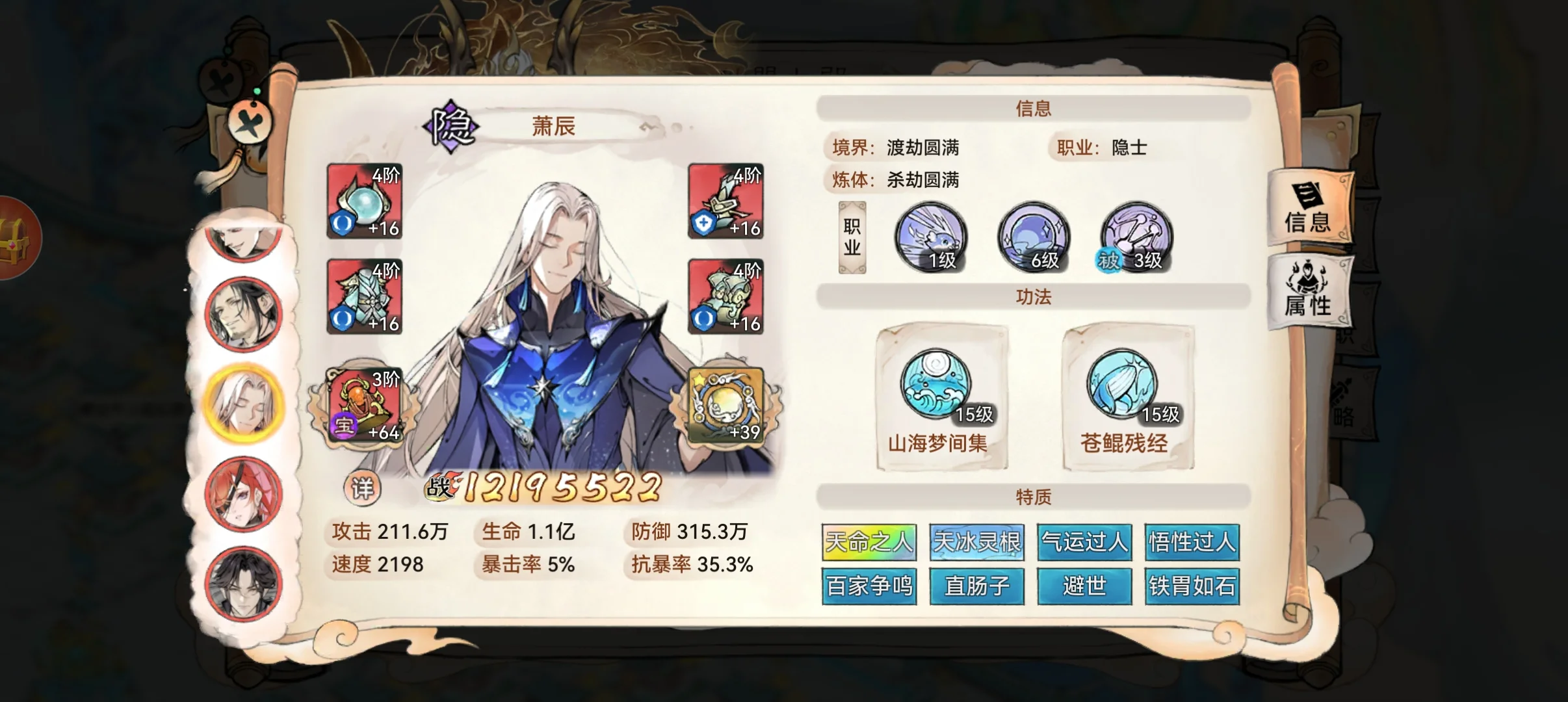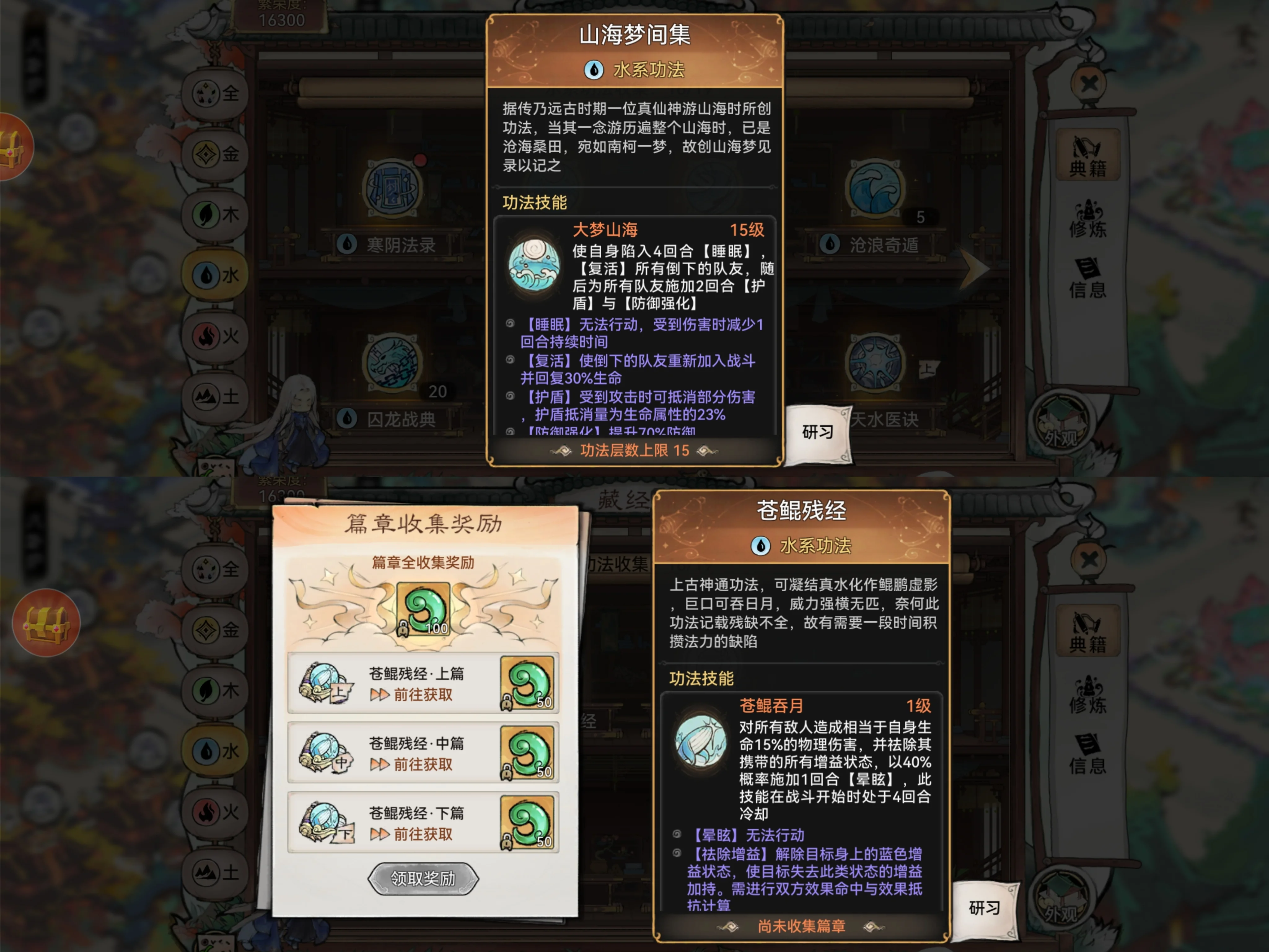 功法:山海+沧鲲(山海必带复活功法,沧鲲不仅可以对全体敌人造成伤害,还能驱散敌人增益和眩晕,受到攻击还可以降低敌人的攻击)