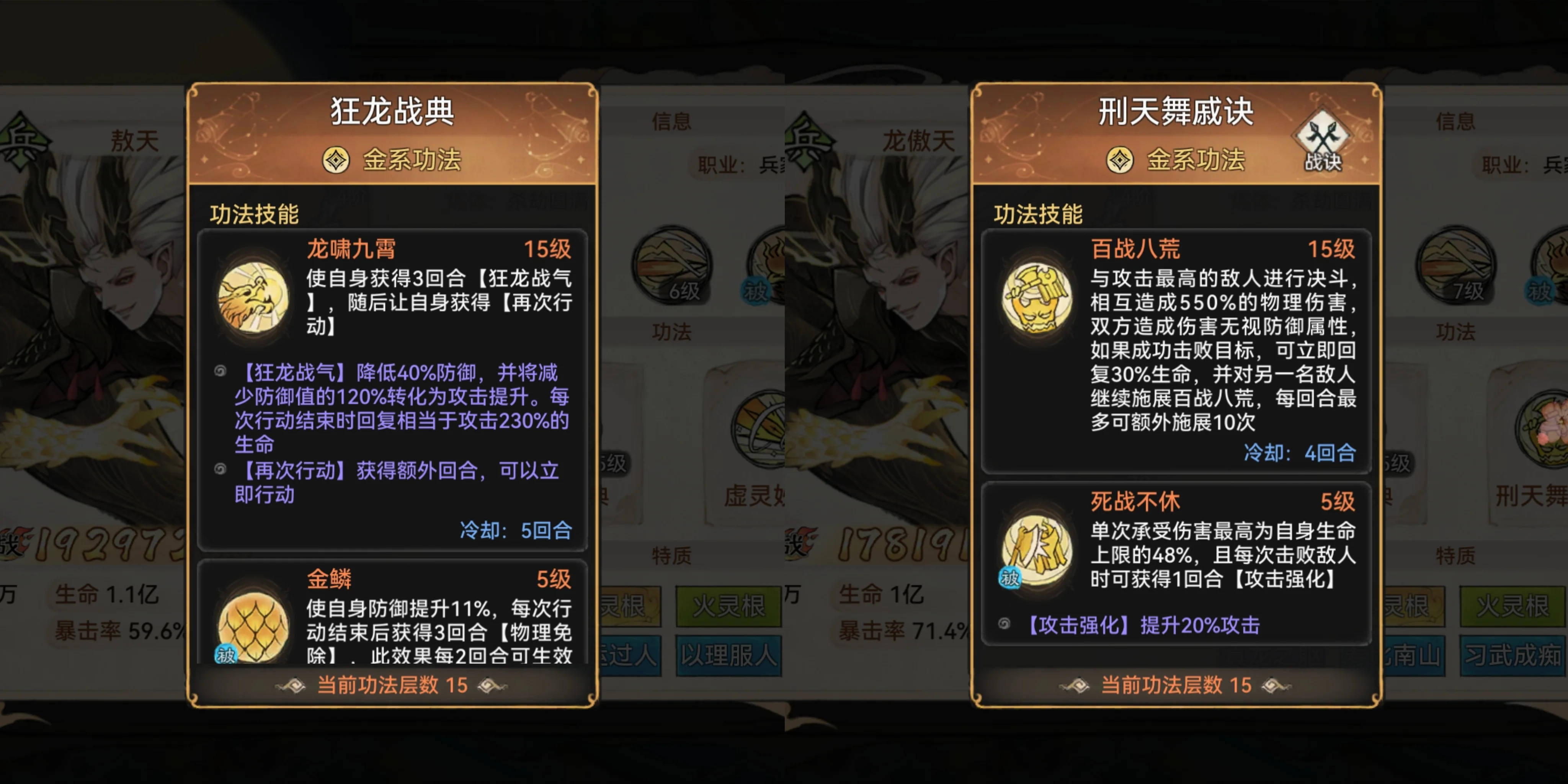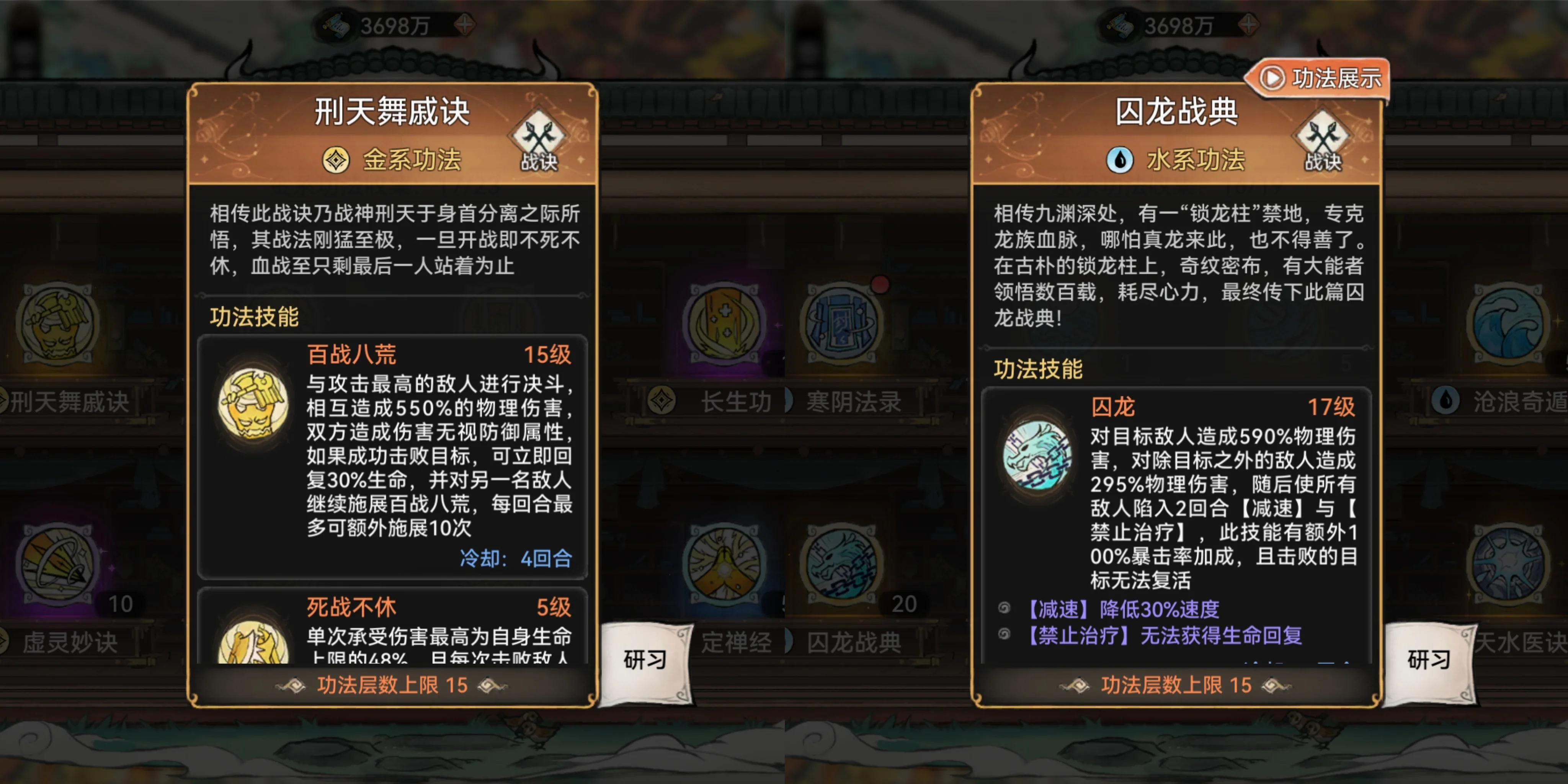 功法:刑天+囚龙(刑天必带,防止对面的囚龙,囚龙是我们核心输出功法)。