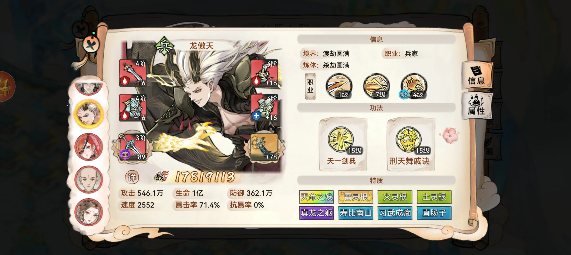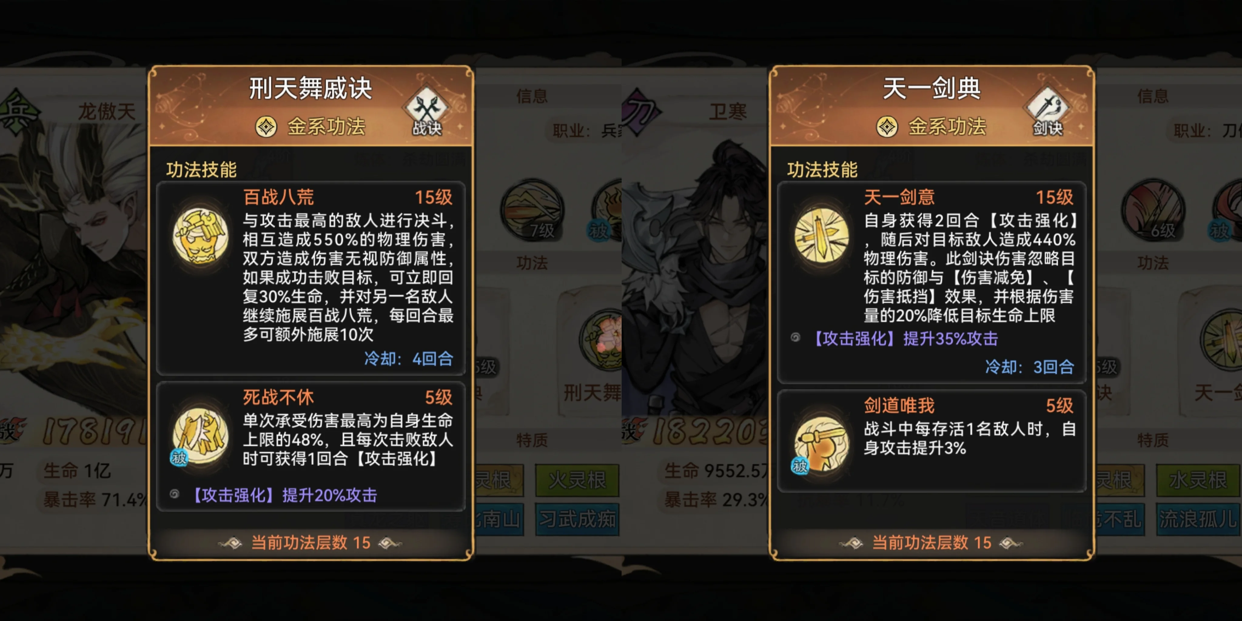 功法:刑天+天一/狂龙(刑天必带,天一和狂龙都可以,看自己有哪个功法。)