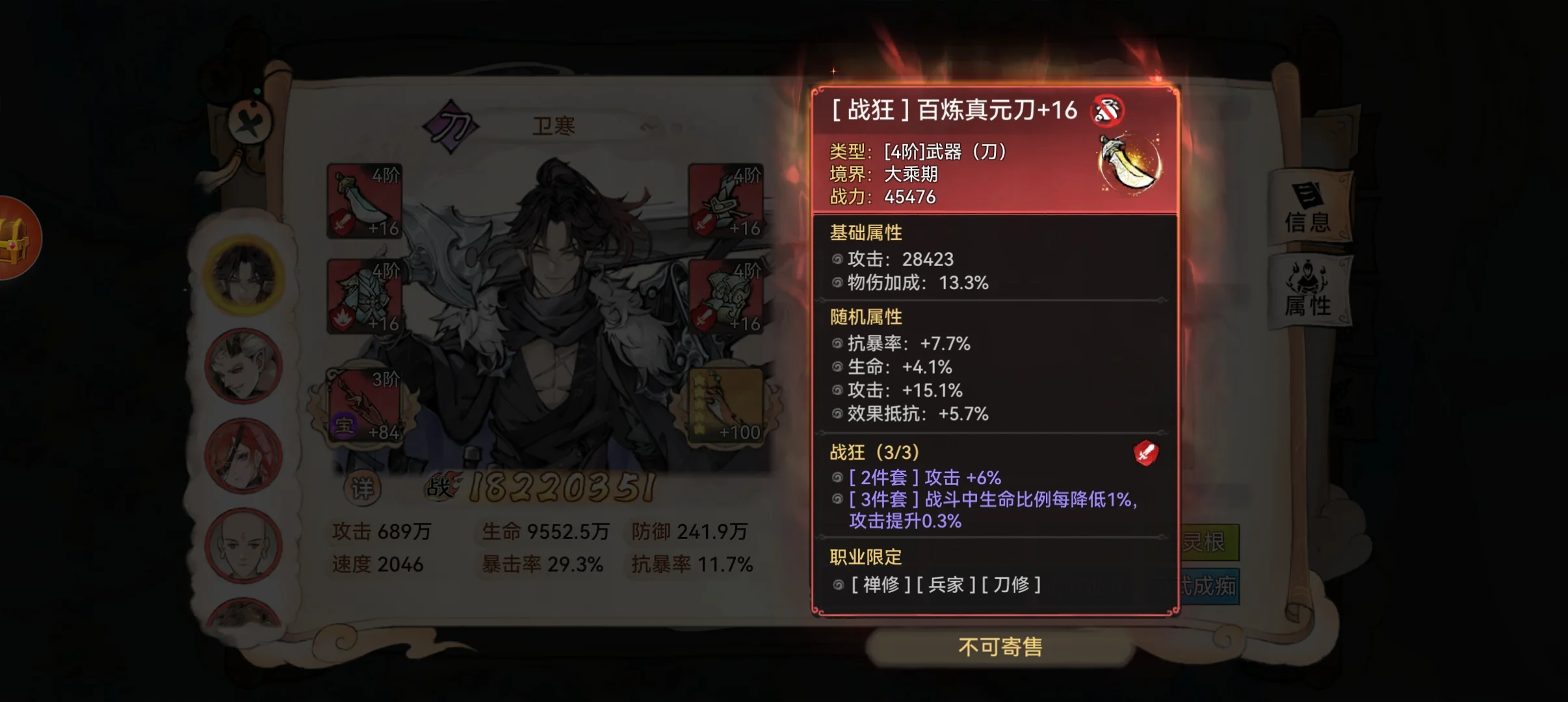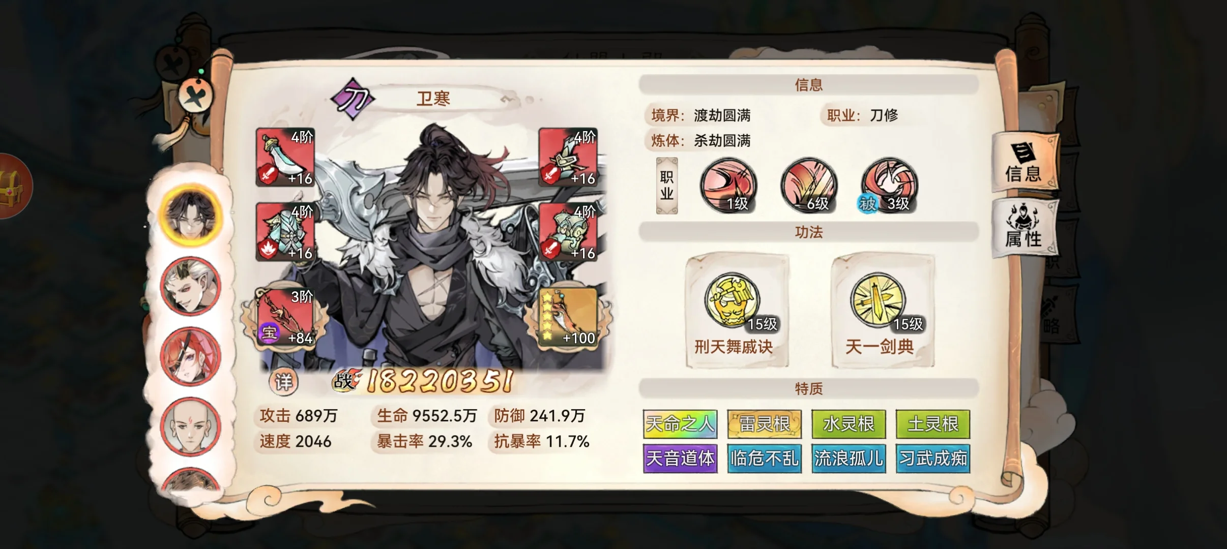 卫寒:铁桶阵容必备的角色,优先放前排。自身有免死机制,能抗能打。普攻还可以减少目标的生命上限。功法可以带:刑天+天一剑典。