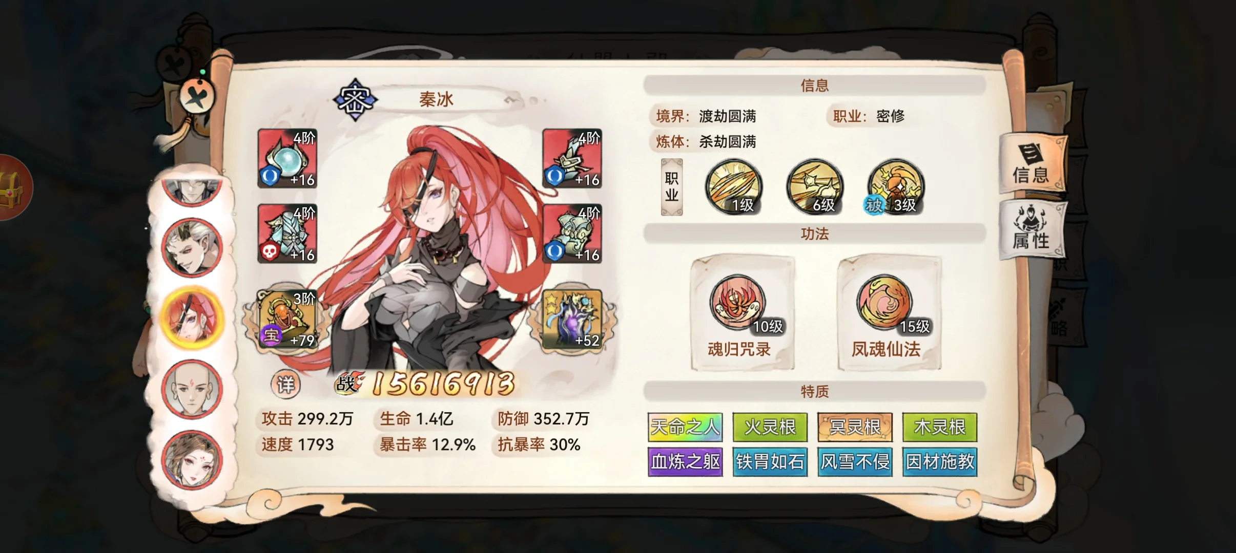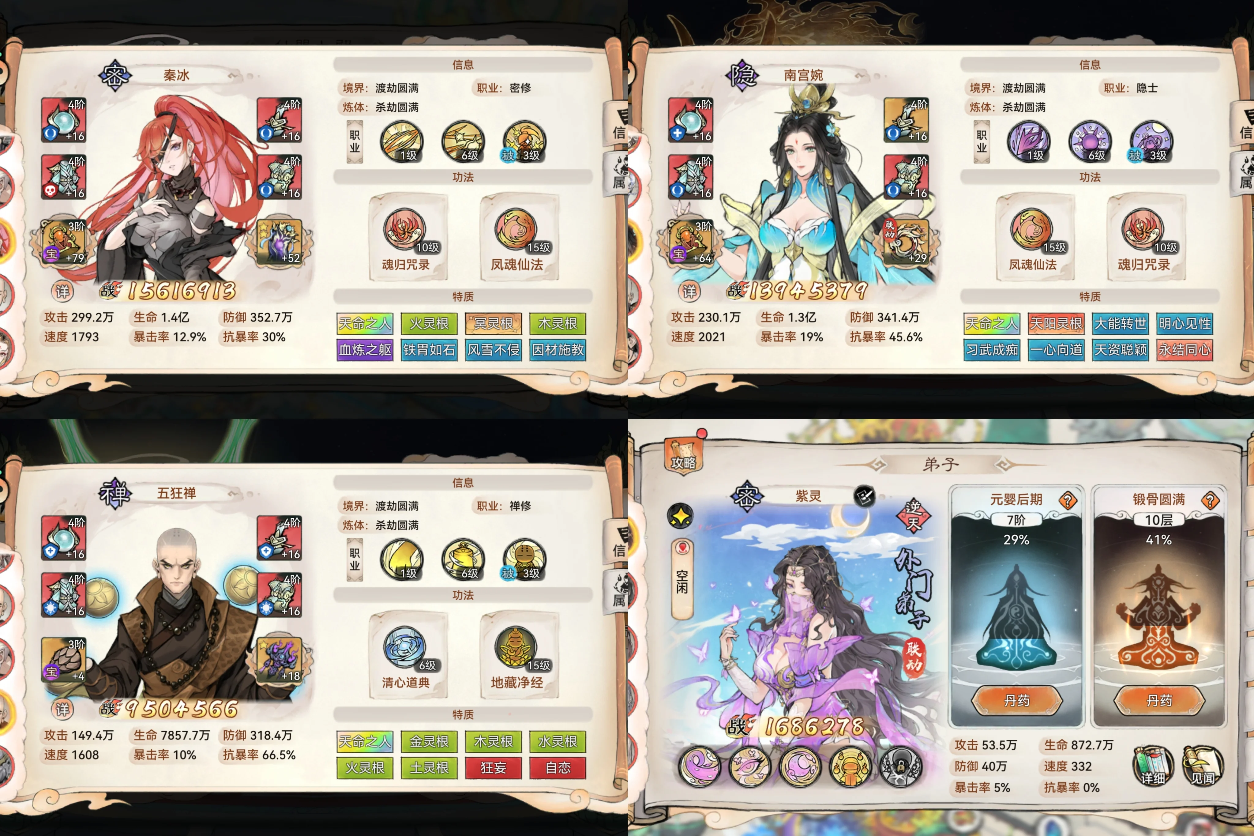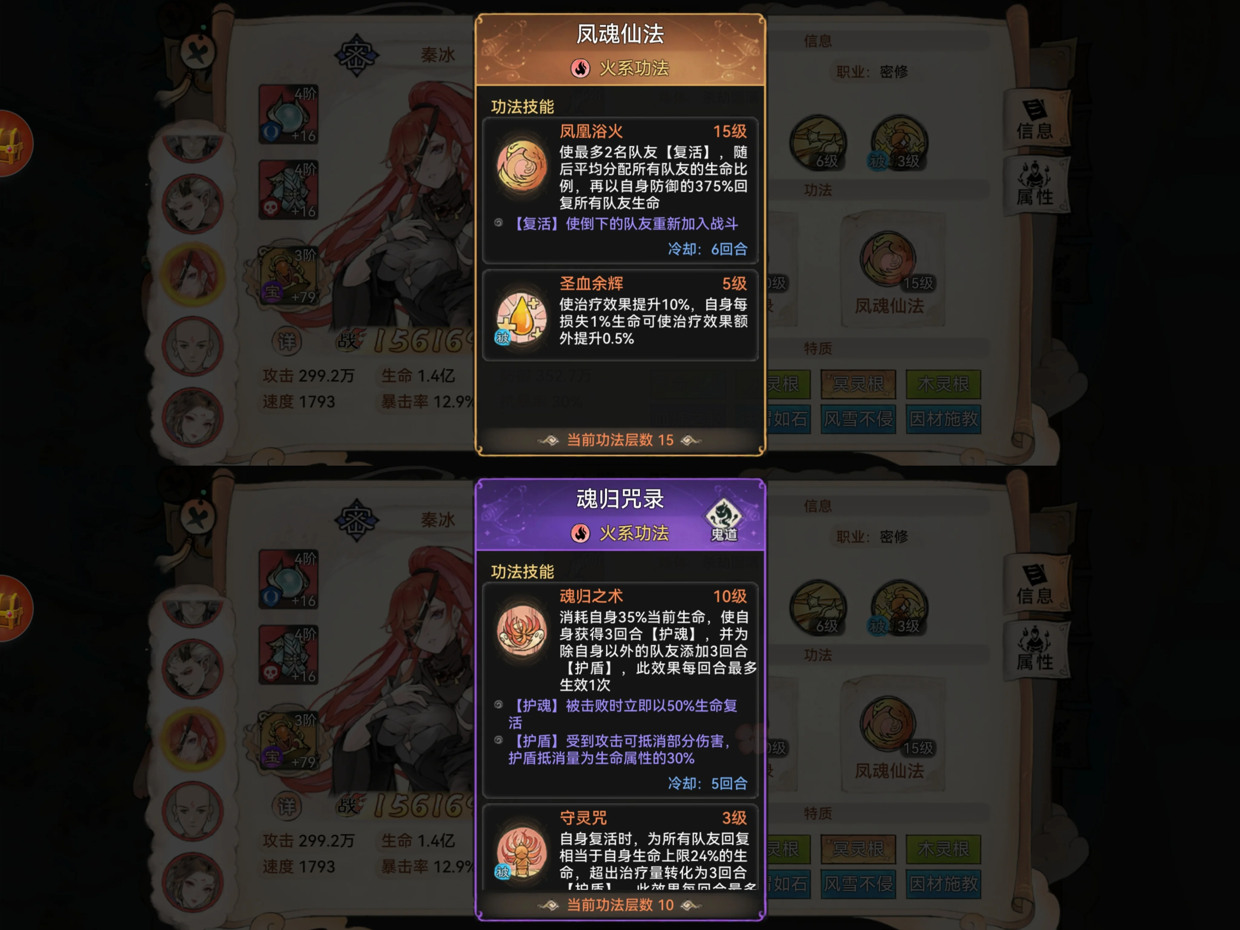 功法:凤魂+魂归/山海。(凤魂+山海双复活yyds秦冰不能带山海,就带魂归,紫灵带山海。)