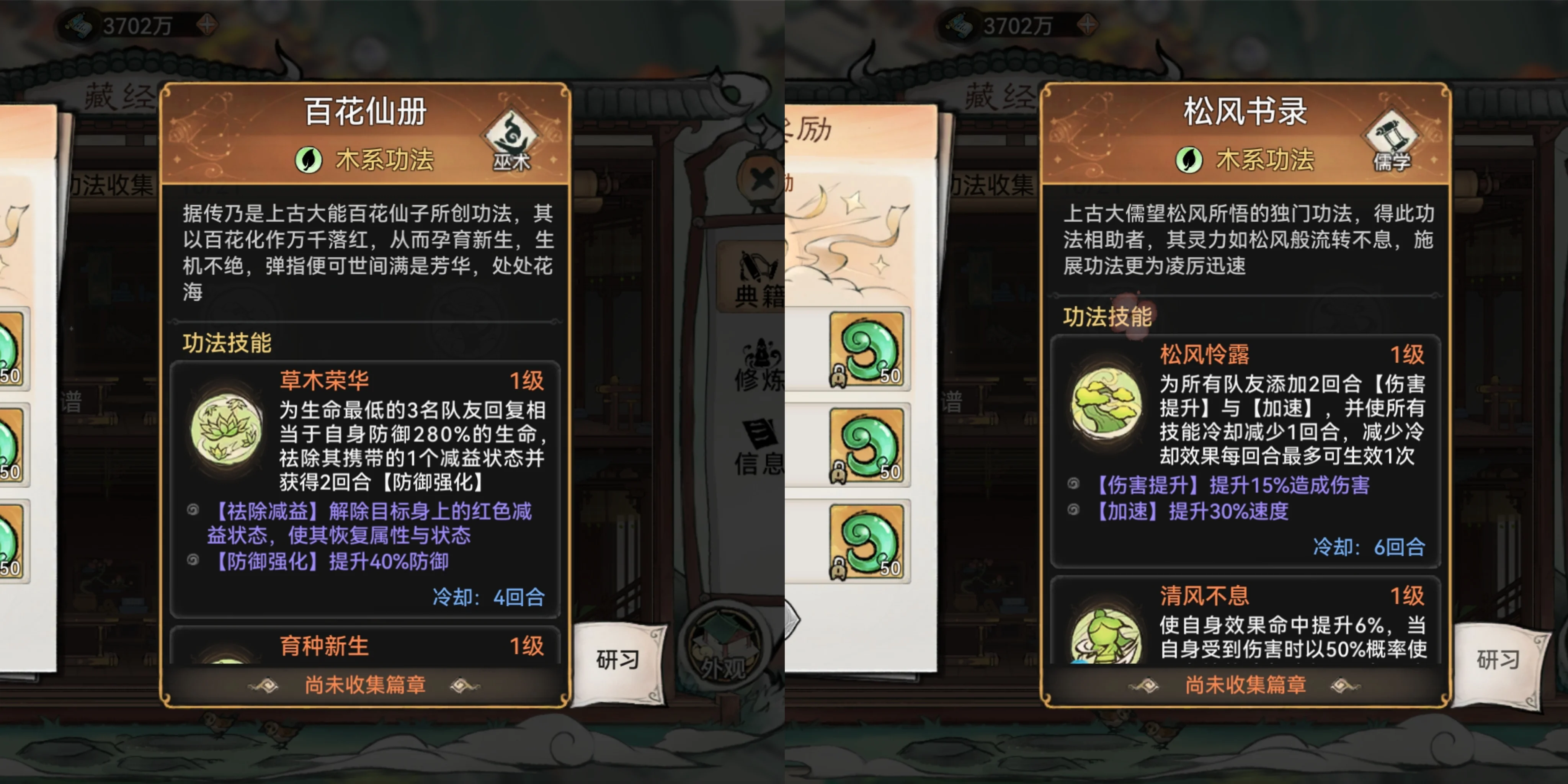 三:【阵容】功法装备法宝搭配推荐。①苜蓿功法搭配:百花仙册+松风书。