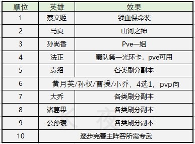【神将】培养优先级顺序:关平-凌统-蒋钦1火-朱然5星-马良-曹操/法正-孙尚香-伏寿-水镜-曹丕-诸葛果-公孙瓒-其他。