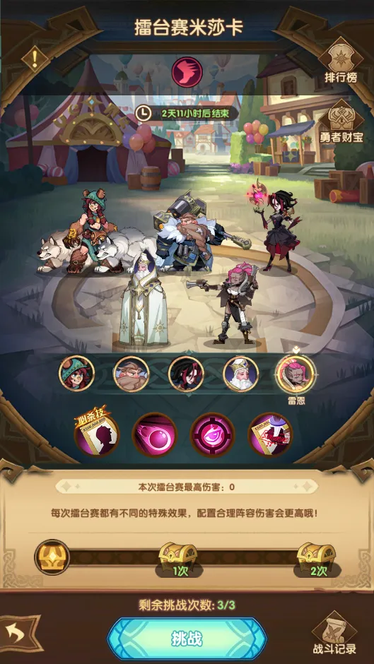 2.四场擂台赛每场擂台赛持续3天,每场擂台赛都有对应的排行榜,排行榜前10%/前30%/前50%的玩家可以获得不同的个人奖励,另外进入前500名的玩家还可以额外获得勇者财宝!