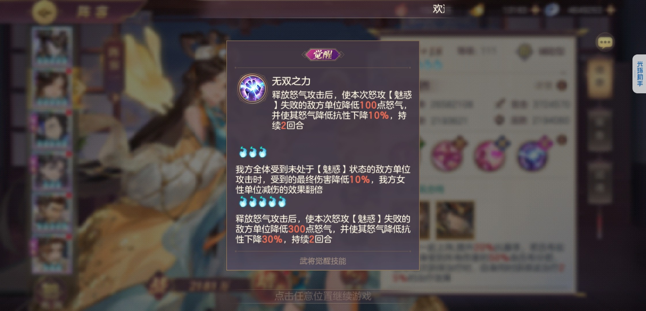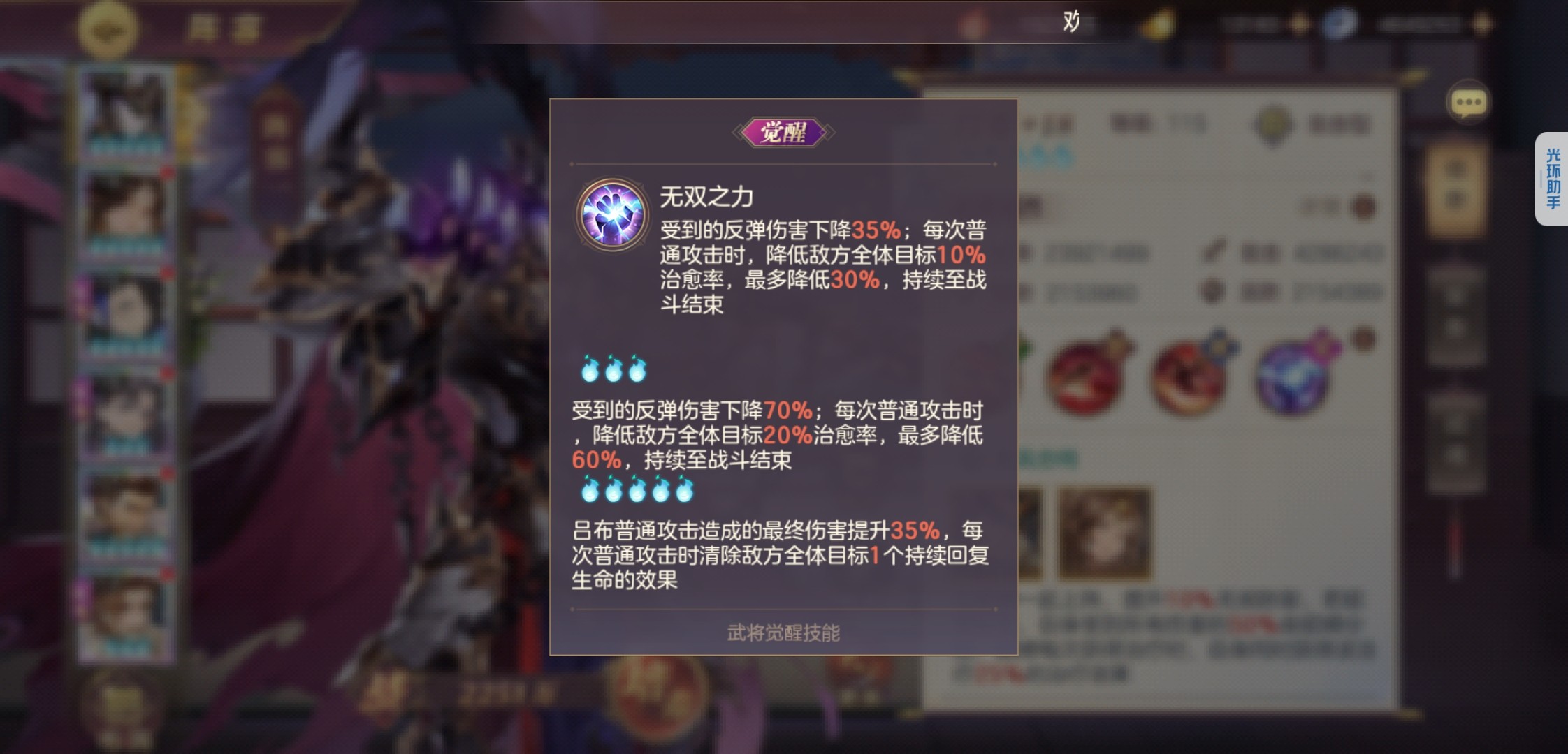 前版本无双之力提供的敌方减员增益面板可观,但不能在竞技中迅速触发的情况下显得尤为鸡肋。作为攻击将,倘若没有其他单位的怒气供给,吕布自身输出频率低,消耗手段单一,敌方奶量足,血线上不能施加压力就是吕布旧版本的缺陷,需要张辽、诸葛亮这些武将扶持。