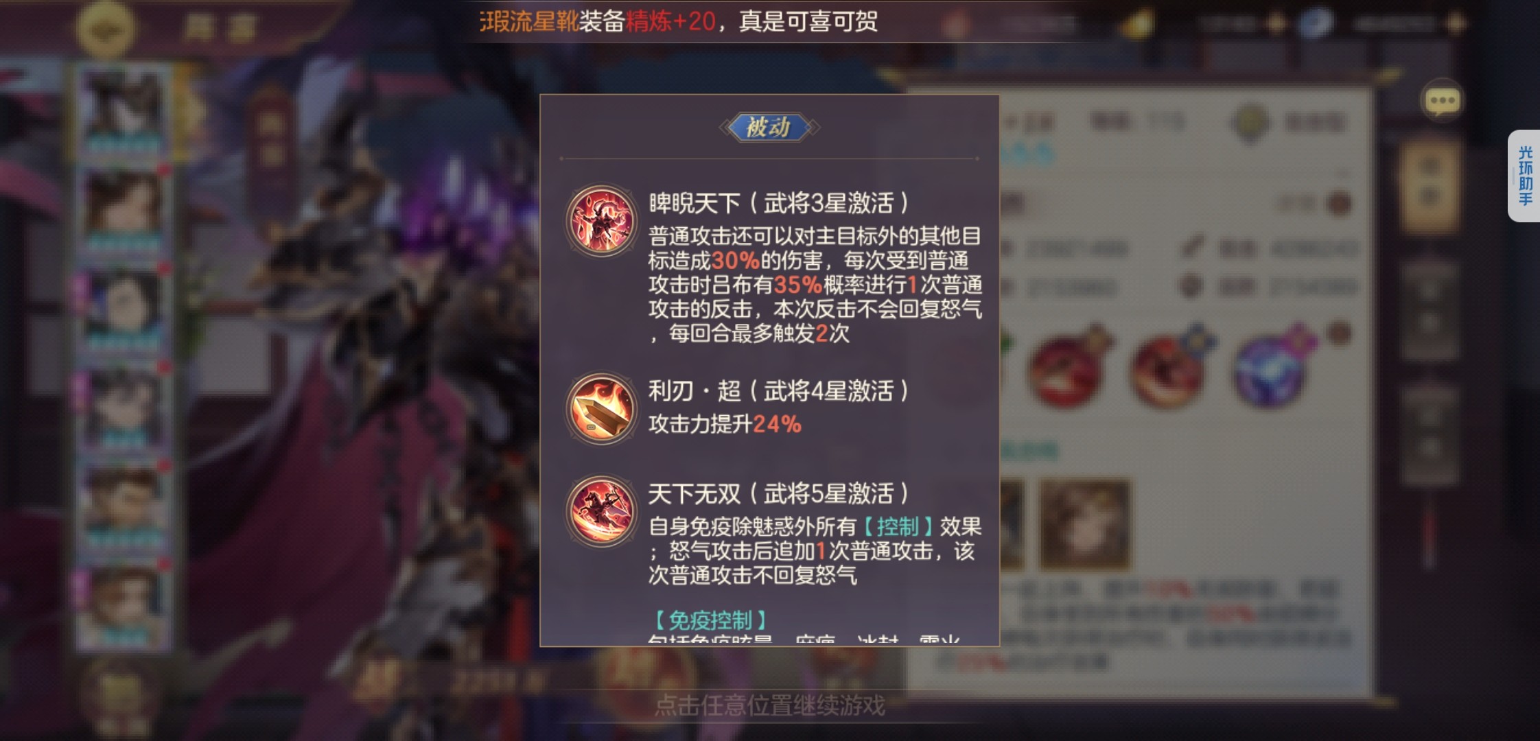 提炼这几个关键字眼,减疗 概率反击 反弹伤害,目前绝大部分阵容都会携带奶妈,减疗的出现变相地提高了吕布的下血线能力,能够打出血量压制,虽然减疗能被驱散,但是对于盾辅以及常规体系的续航能力还有不错的打击力度。概率反击,类似于曹操的反击,但吕布的机制是受到普攻后概率反击一次普攻,不能回复怒气。基于原本的AQA的攻击机制有额外的多了一个下血线的手段,而且还能挂减疗被动以及驱散恢复效果,这个机制的唯一缺点就是需要吕布在前排才能够频繁触发。反弹伤害这个字眼是大多数输出武将惧怕的一点,像董卓、邢道荣以及部分职业的武将进阶都有反弹,新版本吕布能将这种负面收益降到最低,之前战魂只能绑定爆裂冲击来保证自己的血线,现在风险降低,能有更多的选择了。