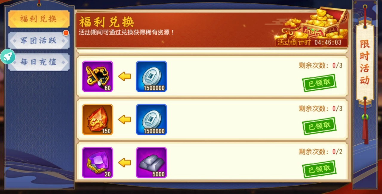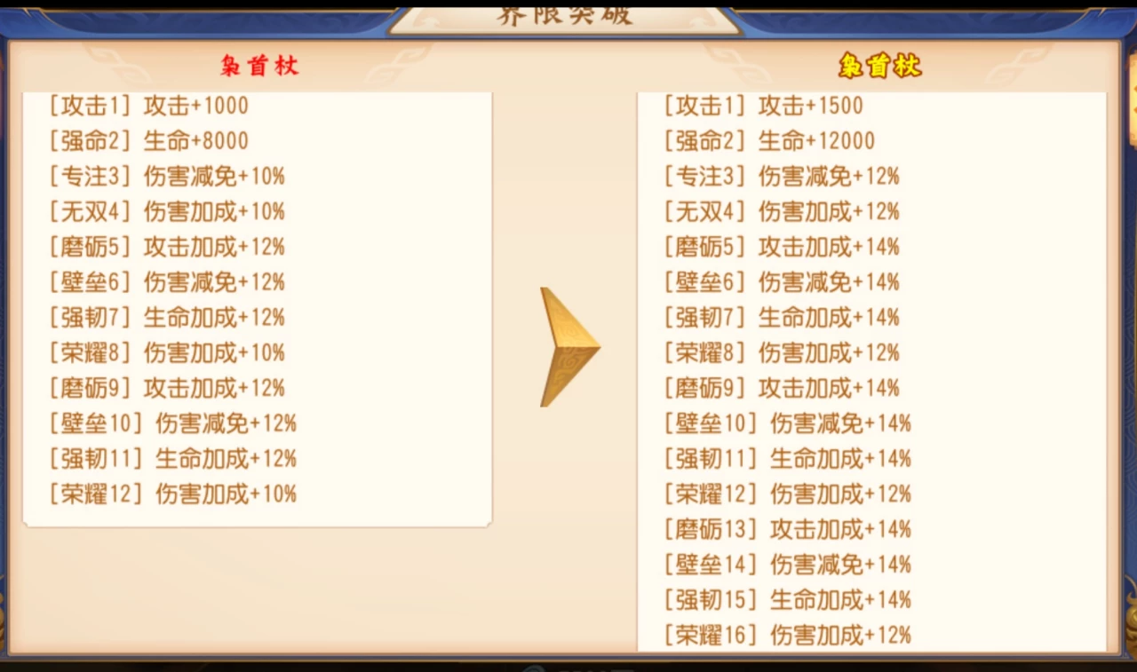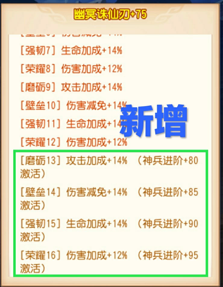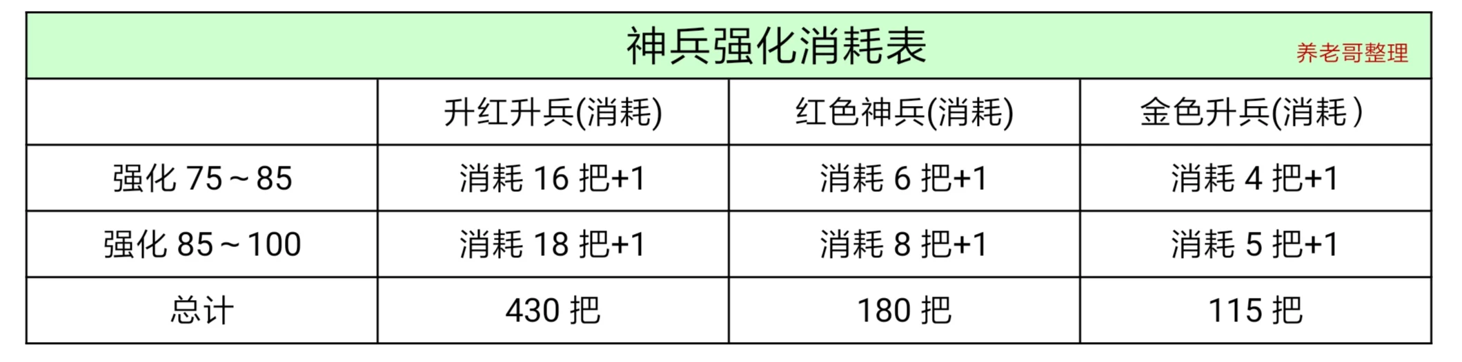 本次更新,无论是红色神兵还是橙升红的神兵都可以突破金色了,突破后可以强化+100,而且到100之后会获得一个“御甲”效果,也就是护盾可以扛一点伤害,值得一提的是红色神兵和橙升红的神兵需要消耗周易礼记各18个升金,与此同时每强化+5还带来了一些属性加成(生命、减伤、增伤)。红将或许还好,后期的一些玩家到目前来说养单红的红神兵都会溢出不少,蹭着还没什么人买,现在开始低价积攒神红兵吧。下面是养老哥整理出来的一个消耗表,可以参考一下。