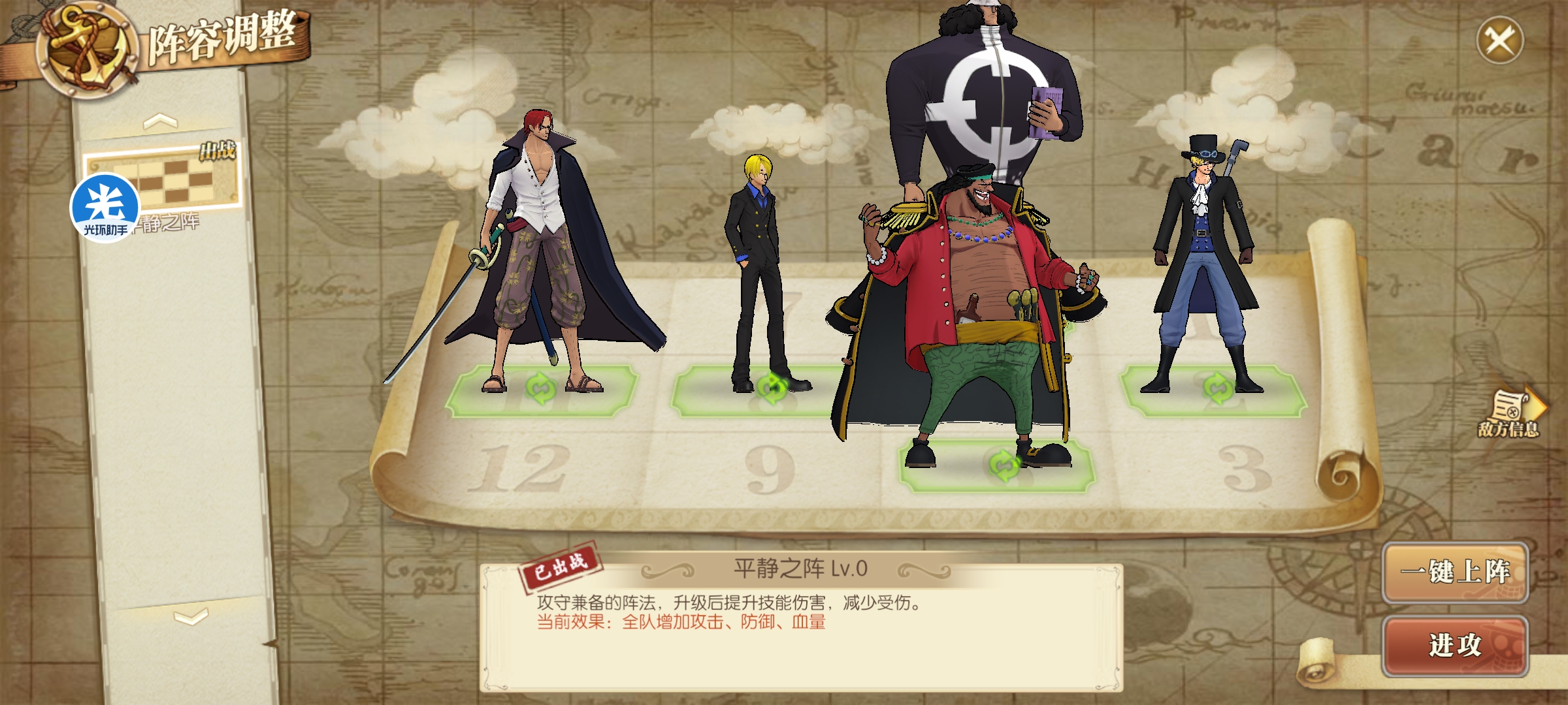 核心是要在击败青雉后及时通过火伤击破青雉属性护盾,这里我选择的火伤角色是山治(七星)和萨博(三星),其它都是辅助输出。