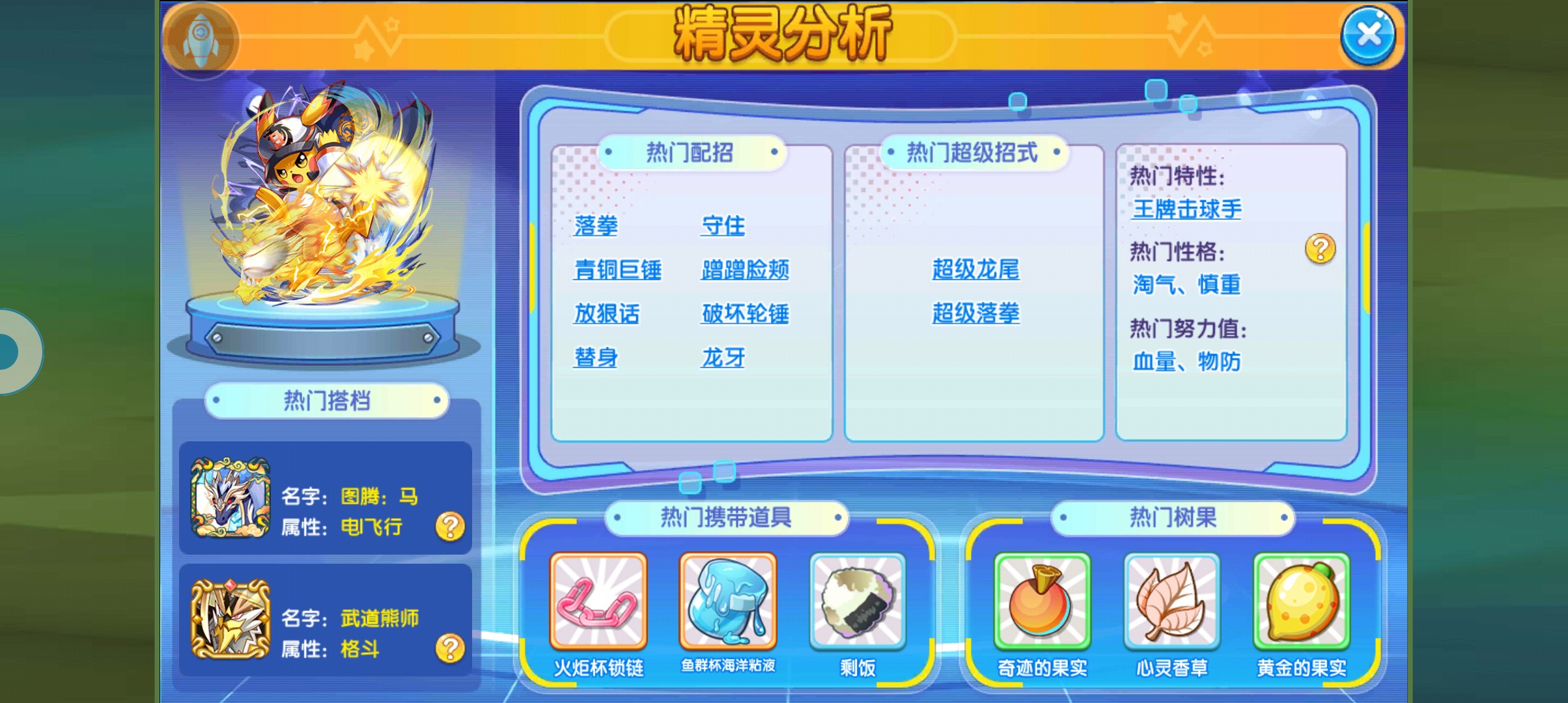 棒球皮卡丘的特点就是满身劝退技能,只要是攻击类型全部拥有劝退效果,主要在于它的特性,使用攻击技能后手,但是会有劝退效果还可以,对对方进行间接伤害,这就让皮卡丘从周年庆入手到一开始两个月左右,非常的热门,现在的话排名是排在了第13位,看似排名比较高,但实际上已经应对不了一些特殊的宠物了,特别是现在的变态宠物越来越多,而且这个精灵它最大的缺点就是难以获得,它是周年庆的特惠精灵,在此期间没有任何返厂的方式,如果要等到春节返厂,那个时候可能就成炮灰了,所以说现在出皮肤,我看真不如把票投给新宠物虚妹更好,现在皮卡丘主要的玩法和以前基本上没什么太大的区别,如果想利用特性多回血的话,可以学习一个守住技能再多回血的同时,也能够测试对方的技能,其余的三个技能的话,基本上还是选择攻击技能比较好,特别是骚扰类型的,比如说蹭蹭脸颊、落拳、青铜巨锤,这几个技能可以说是标配了,没什么可说的道具经过了双11这次活动,嗯,想必部分玩家已经拿到了防御类型的道具,那么大家可以给皮卡丘使用,就比如说粘液杯,上面的精灵分析,上面也提到了可以利用锁链粘液杯和剩饭,大家有什么带什么都可以。