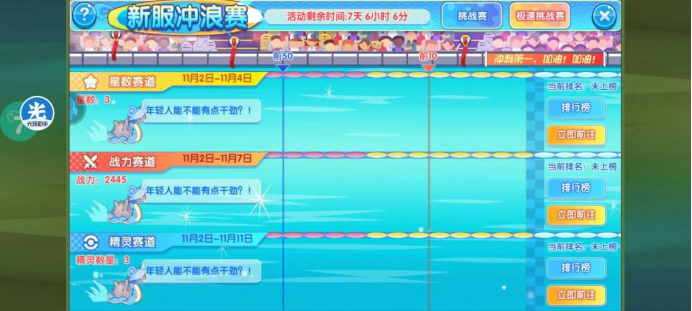 极速挑战赛里的星数赛道主要也是打地图,与挑战赛的冒险专家不同,该挑战时长短,一般在挑战完黄金市之后(1080星数)就会戛然而止,因为道馆有等级限制,浅红市道馆46级开启,因此该挑战会出现同星数的情况,所以我的建议是新服开启之后就去打地图升级来获取该挑战所需的星数,当然该挑战奖励也是十分丰富。