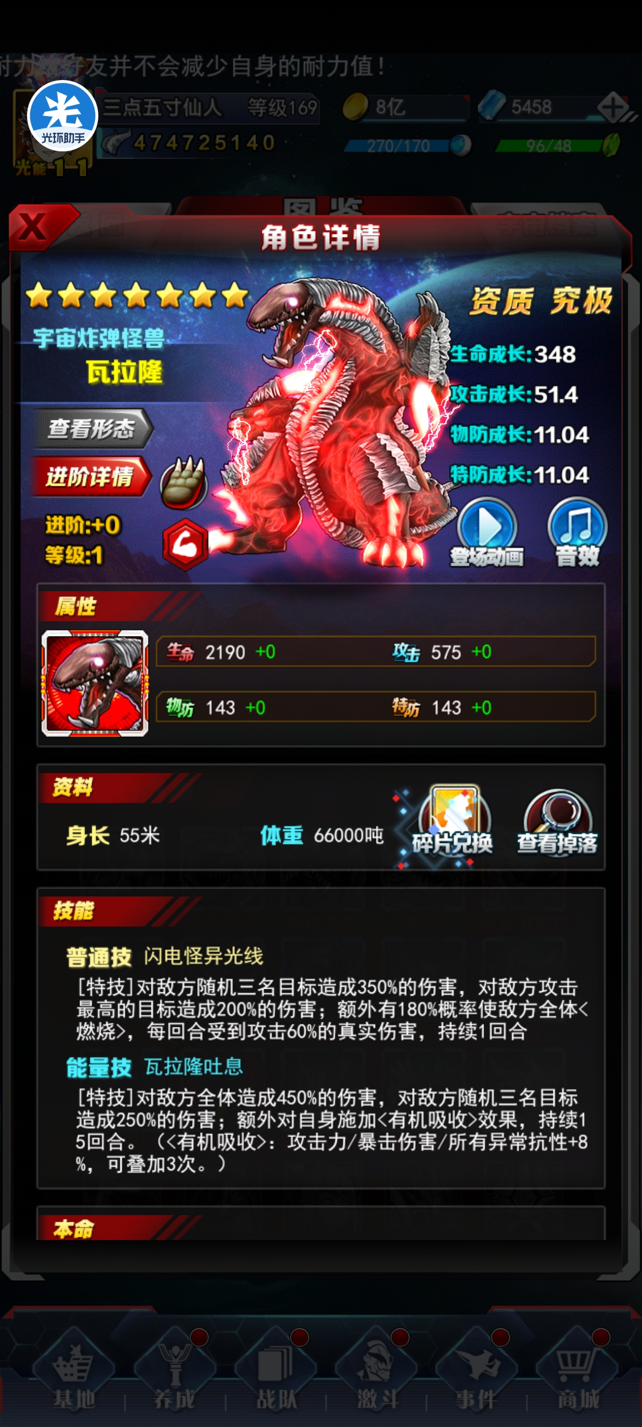 1.瓦拉隆施放主动技时,若敌方场上存在布莱泽基础形态(若不存在,则改为敌方能量最多的目标),则在施放主动技后对其追加施放一次《能量吞噬》,并进化为「瓦拉隆宇宙炸弹怪兽·第二形态」,每场战斗限触发1次。