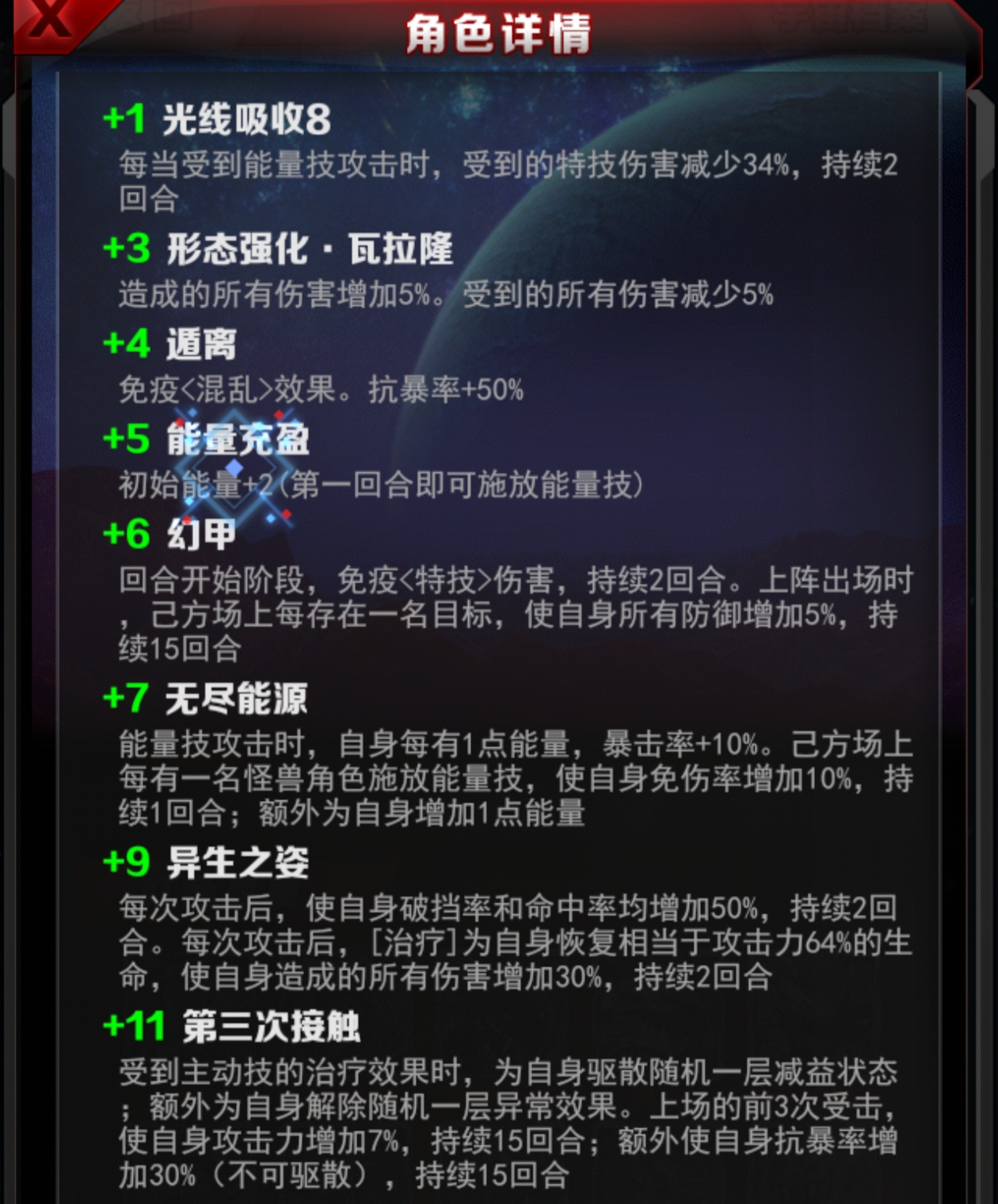 1.每当受到能量技攻击时,能使受到的特技伤害减少34%,持续2回合。这一被动在面对敌方能量技攻击时,提供了显著的减伤效果。由于是针对特技伤害的减免,在对抗以特技伤害为主的敌人或技能时,能有效提升角色的生存能力。