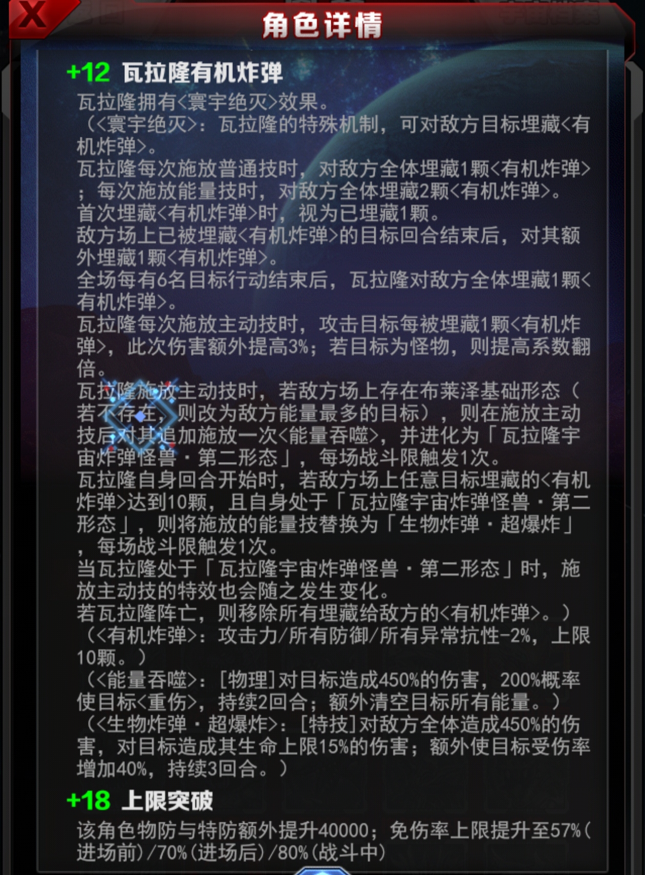 1.普通技与能量技埋设:瓦拉隆每次施放普通技时,对敌方全体埋藏1颗《有机炸弹》;每次施放能量技时,对敌方全体埋藏2颗《有机炸弹》。首次埋藏《有机炸弹》时,视为已埋藏1颗。这意味着从战斗开始,瓦拉隆就能够迅速在敌方目标身上开始放置《有机炸弹》,随着技能的不断释放,敌方目标身上的《有机炸弹》数量会逐渐增加。