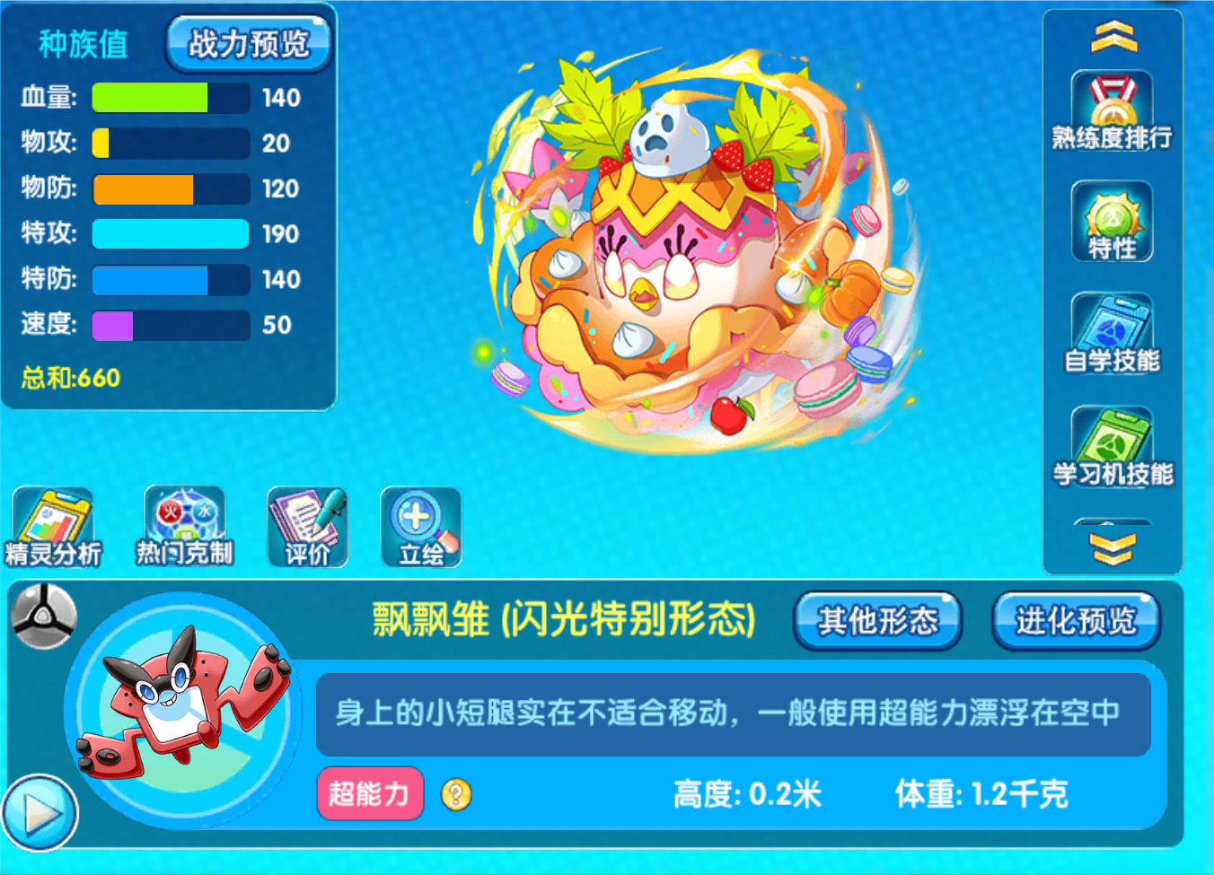 性格:保守、冷静,努力值:血量特攻,道具:疯狂面具,特性:超能浮游,超级招式:超级回复封印
