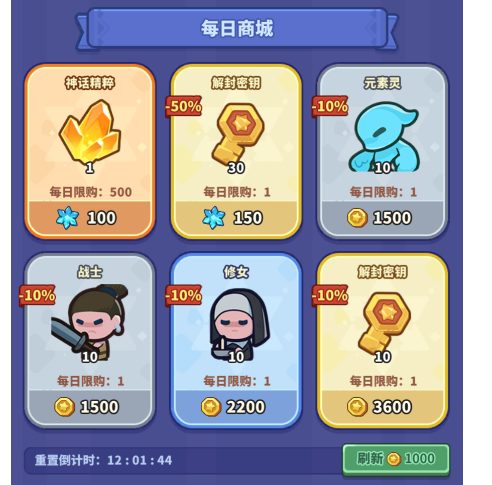 2,游戏主界面左下角的“商城”内,“每日商城”位置,每天会随机刷新。其中的用金币购买的道具,游戏初期每天尽量买光,提升英雄等级来提升总暴击。有白色到金色的英雄碎片、金钥匙、冰镐等等。