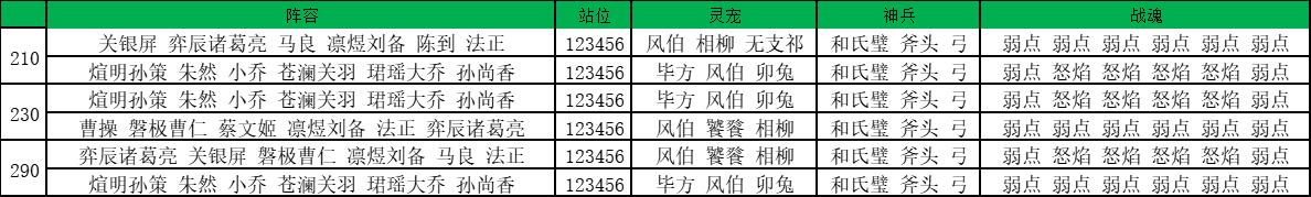 战魂:吕玲绮、蔡文姬、孙尚香、蒋钦、朱然、孙尚香、雷霆赵云怒焰灭袭;张星彩、凛煜刘备连携加护;重溟张飞、苍澜关羽、法正、弈辰诸葛亮、煊明孙策、曹操、磐极曹仁、珺瑶大乔、昭珩陆逊弱点突袭;