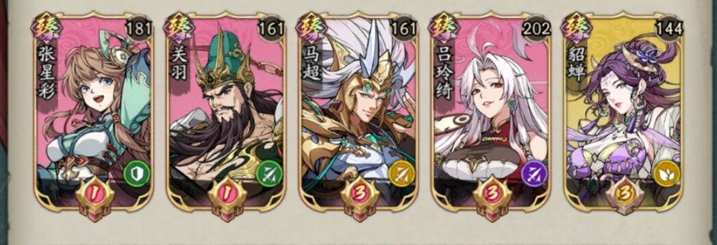 这么一个搭配组合的情况主要也是为了解决狗粮卡的问题,很难做到可以上阵五个同阵营的武将,因为很难升星。
