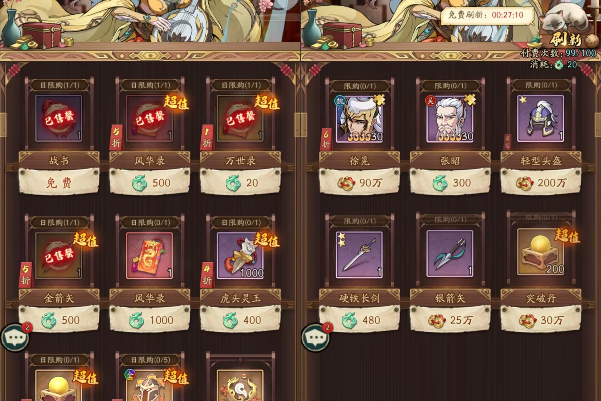 ①日常商铺:5折的风华录和1折的万世录直接无脑购买就行,性价比很高。