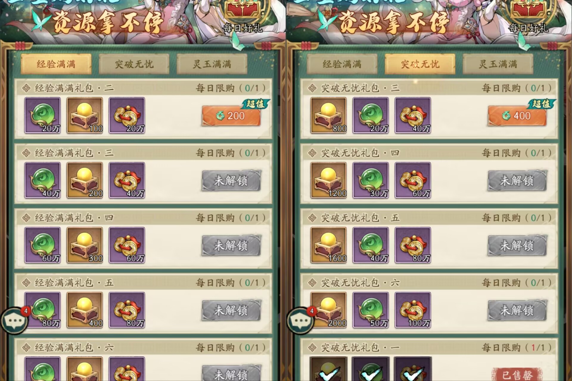 里面一共有三大类资源礼包:经验礼包、突破礼包和灵玉礼包。