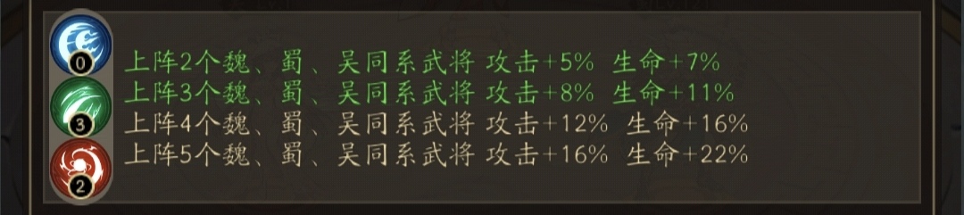 这里辅助选诸葛亮的原因是这个阵容主要输出位是蜀国,诸葛亮对蜀国有额外的一个加成,暴击率额外提升5%,也就是暴击率最高额外附加20%。治疗也是治疗血量最低的三个,虽然三个不多但覆盖率也达到了60%毕竟我们只有5张卡。
